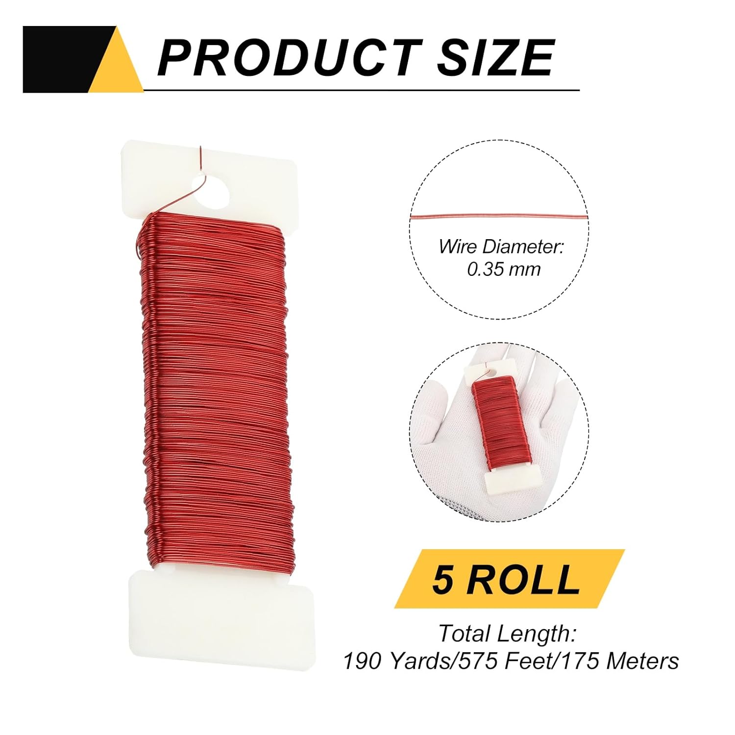 What is it? This flower wire is suitable for various festive decorations, such as making Christmas garlands, hanging Christmas decorations and bouquet ligament to help you fix the position of fresh flowers and prevent them from scattering. It can also be used to create fine pot art, bows, crafts and more. What will I receive? Colour: red. Material: aluminium. Total Length: 190 yards/575 feet/175 meters Diameter: 0.35mm/27 Gauge Package: 5 rolls of metallic flower wire (38 yards/roll) What are the benefits of the product? Our Flexible Flower Wire Is Made Of Quality Metallic Wire, Fade And Rust Resistant. The thread has a smooth surface that is gentle on the fingers during use. It is foldable but holds its shape well, allowing you to fold it as you want. This flower wire is suitable for various applications, from crafting to fixing wedding bouquets. How to use it? Measure the required length of flower wire, cut it with scissors or pliers and then fix the wire in place. What should I pay attention to? Please confirm the size and colour you need before purchasing.