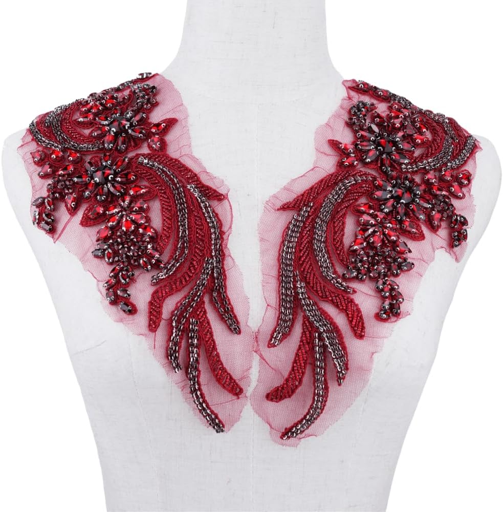 1 Pair Hand-Made Beaded Rhinestons DIY Clothing Appliques Patch Flower Applique Patch for Wedding Dress Decoration