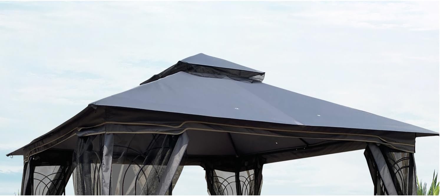 Material: PolyesterColor: GrayDimensions: Base Cloth: 117"x117", Upper Opening: 25.56", Top Cloth: 35.04", Bottom Flap Edge: 106.7"Weight: 4.4 lbsPackage Includes: Canopy fabric onlyMounting Type: Frame attachmentNotes: Color may vary slightly from images due to chromatic aberrationCompatible Models: 10x10 Ft FrameCarton Size: 19.69"x12.99"x3.15"Carton Weight: 4.89 lbs10x10 Ft Patio Double Roof Gazebo Replacement Canopy Top Fabric is a durable polyester canopy designed for outdoor use. The water-repellent fabric offers weather fastness, making it ideal for patios, lawns, and porches. Easy to install by securing corners to the frame, this replacement canopy provides protection from sunlight and light rain. The gray color adds a sleek aesthetic, while the lightweight design ensures hassle-free setup and storage. Includes all necessary fabric components for a 10x10 Ft frame. Note: Color may vary slightly from images due to lighting conditions.