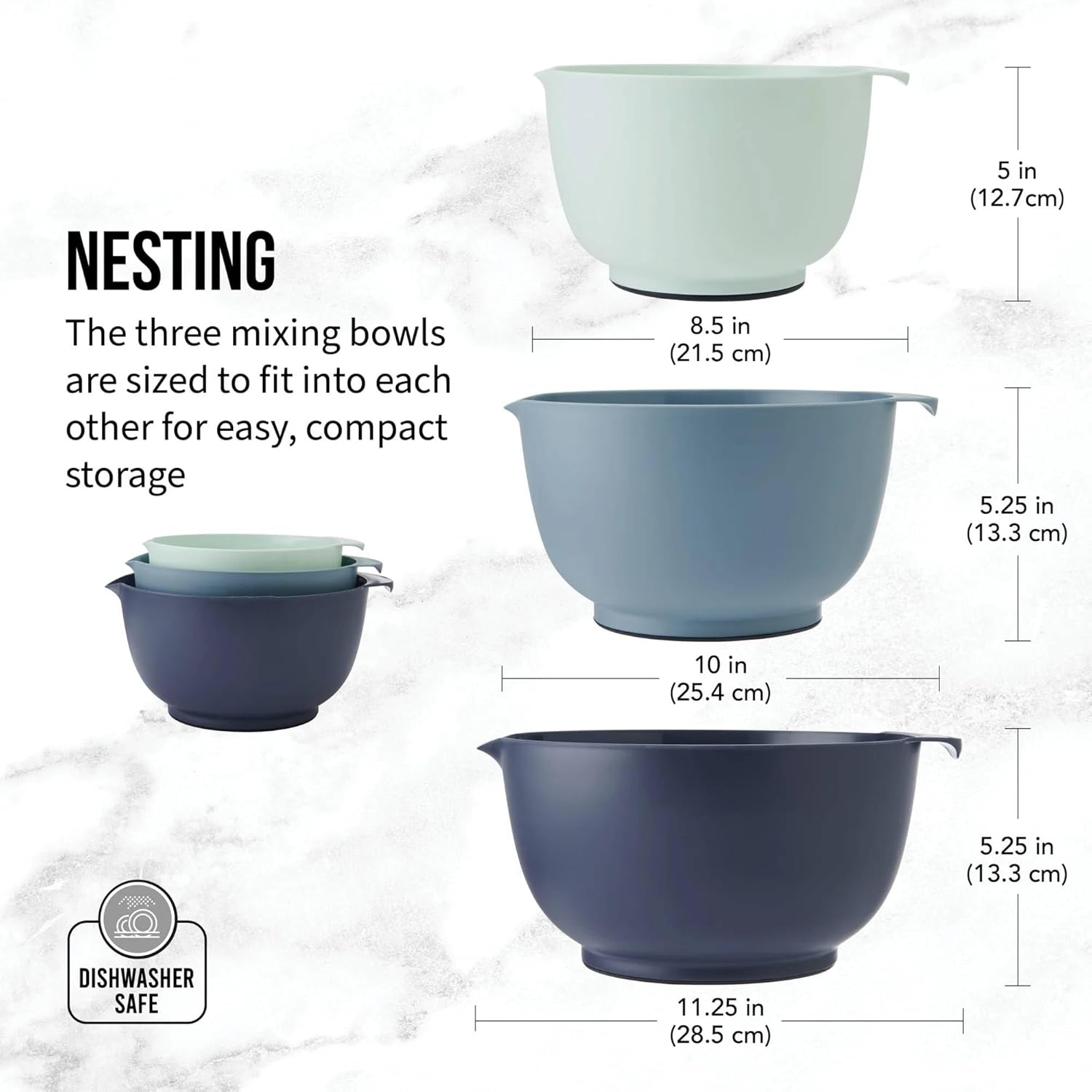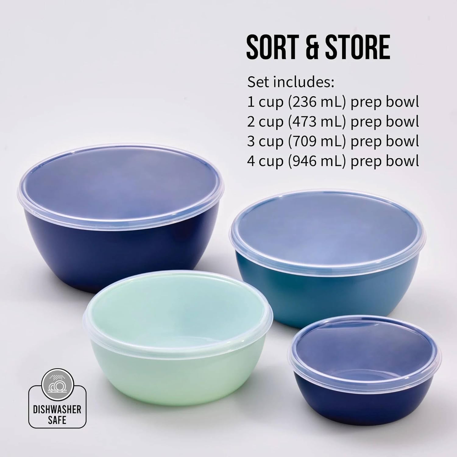 This 11 piece mixing and prep bowl set is designed to support a wide range of kitchen tasks, from food preparation to storage. The set includes three mixing bowls in 2.5 quart, 3.5 quart, and 4.5 quart sizes, each featuring a non-slip base for added stability and a pour spout for easy handling. Four prep bowls in 1, 2, 3, and 4 cup sizes are also included, each with a matching lid to help keep ingredients organized or store leftovers. Made from durable materials and finished in a clean blue color, all components are top-rack dishwasher safe for easy cleaning. This versatile set is suitable for everyday cooking, baking, and meal preparation.