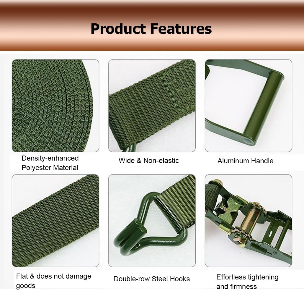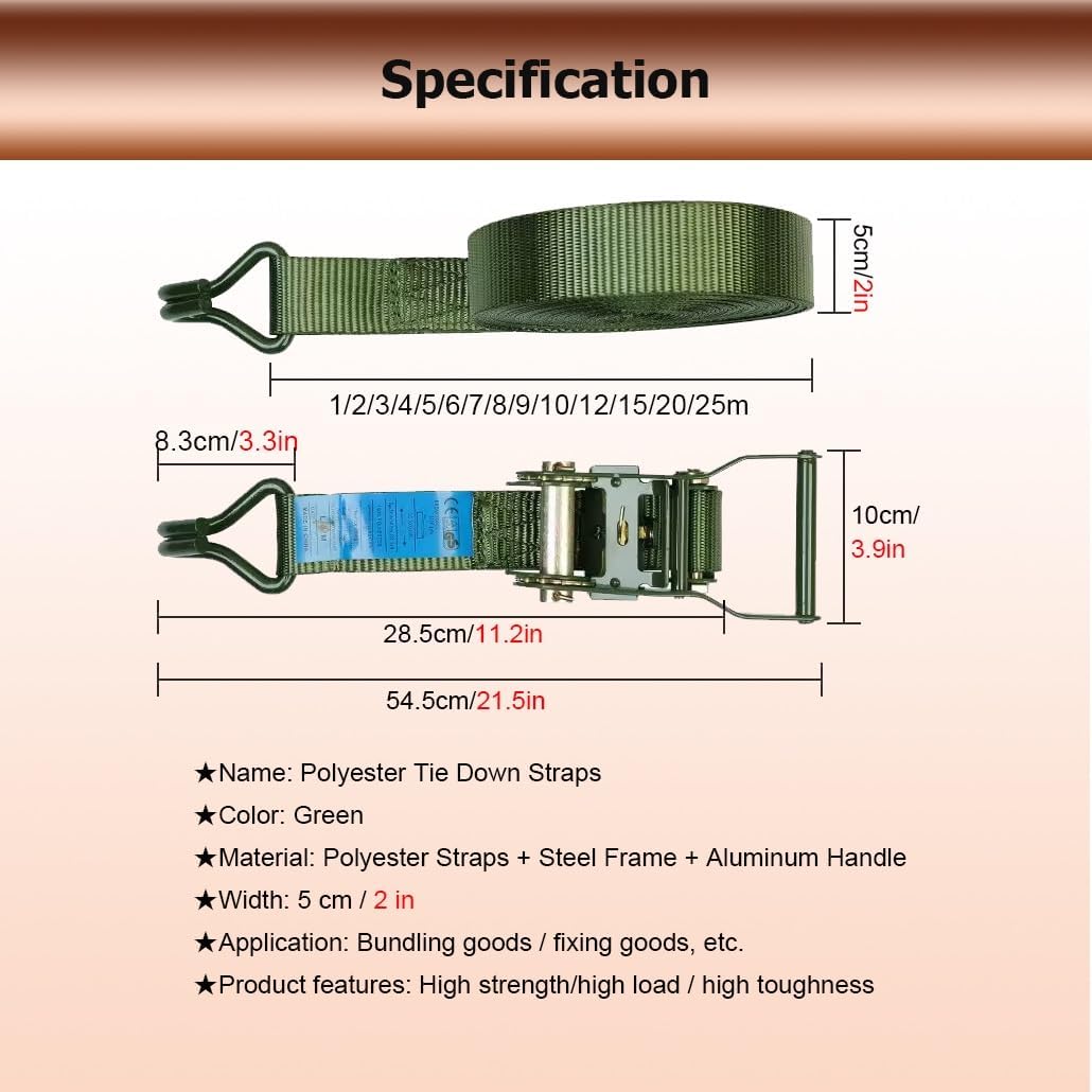 Are you still worried about cargo falling off easily?Heavy duty ratchet straps with steel hooks, tie down straps can be widely used to secure cargo for moving and securing equipment, motorcycles, trucks, vans, kayaks, warehouses, etc.Specifications: Name: Polyester Tie Down StrapsColor: GreenMaterial: Polyester Straps + Steel Frame + Aluminum HandleWidth: 5 cm / 2 inLength: (1-25) m / (3.3-82) FtApplication: Bundling goods /fixing goods, etc.Features:1. High-density cargo straps are wear-resistant and break-resistant2. Cargo straps are easy to use, not easy to fall off and can be fixed immediately3. Truck straps have an easy-release mechanism to easily release the tension on the straps4. Ratchet straps have double-stitched edges to prevent slipping during use; ensure that the cargo is firmly fixed in place, giving you peace of mind when transporting cargo; reinforced stitching adds extra strength and stability to the straps5. Lashing strap are equipped with double J-hooks for easy fixation6. Tow strap have strong pulling force, 6 tons/13227 lbs7. Tie down straps are widely used, including moving, securing cargo, camping or other tie-down needs, such as warehouses, motorcycles, canoes, kayaks, ATVs, trucks, boxes, furniture, lawn equipment, etcPackage Included:Heavy Duty Ratchet Strap with HookTighten Ratchet Straps Steps:1. Pass the strap under the tensioner rotating shaft2. Pass the strap through the center slot of the tensioner rotating shaft3. Pull the tensioner handle back and forthRelease Ratchet Straps Steps:1. Fasten the safety plate outwards2. Open the tensioner to level3. Pull out the strapNotes:1. Due to manual measurement, there may be a 1-2 cm error, please understand2. Due to different monitors, there may be color differences, please refer to the actual product3. Do not use as a vehicle tow rope, car towing needs to be more load-bearing rope