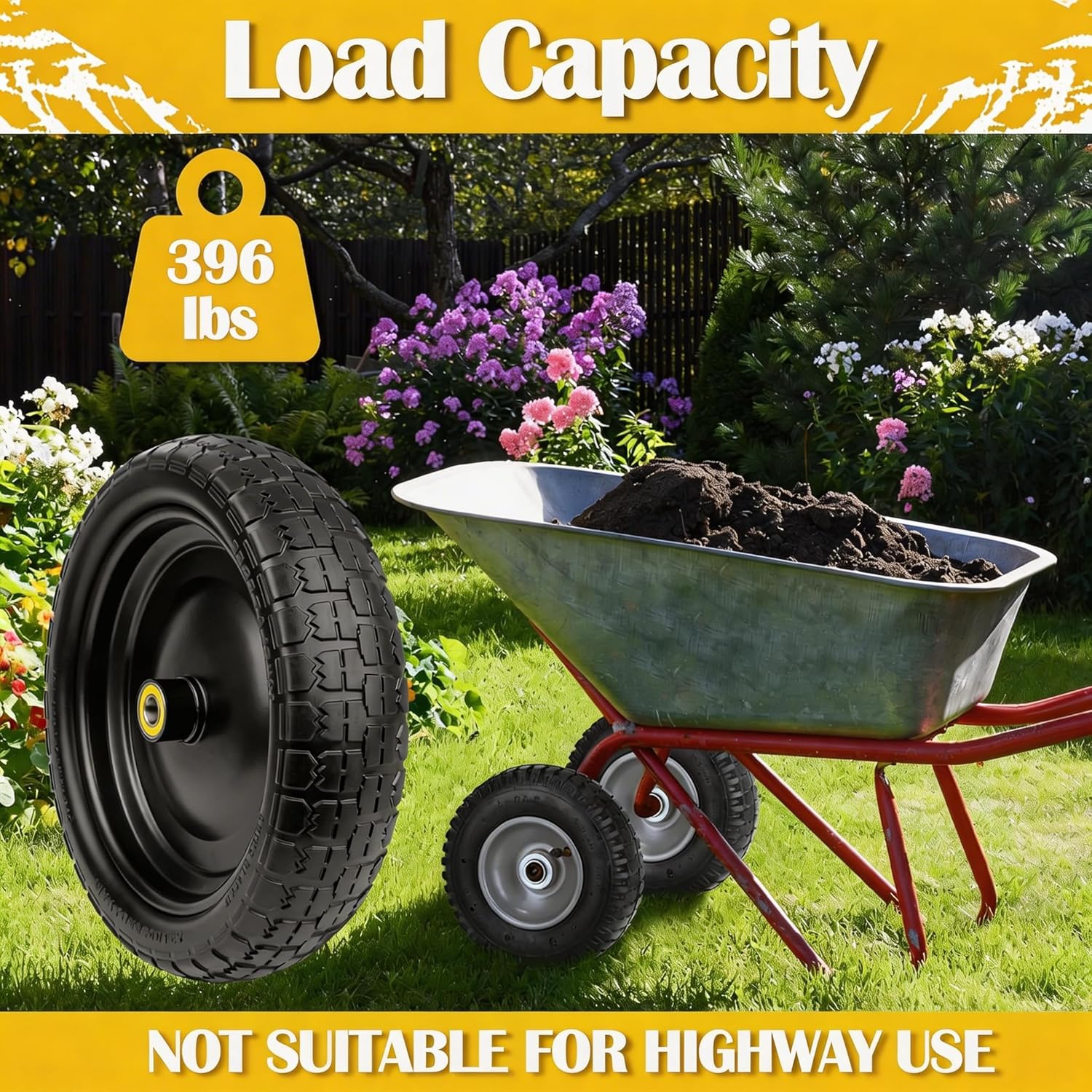 G orilla Cart 13" Flat-Free Tires - 4 Pack: Heavy-Duty Performance for All Your Hauling Needs Tired of frustrating flats and punctures interrupting your outdoor tasks? Upgrade your garden cart, hand truck, or yard trailer with our G orilla Cart 13" Flat-Free Tires. This 4-pack of robust, solid rubber tires is engineered to provide unparalleled durability, performance, and peace of mind, allowing you to tackle any terrain with confidence. Unmatched Durability & Flat-Free Reliability: Solid Flat-Free Design: Say goodbye to flats and punctures forever! Our 4.00-6 solid rubber tires are completely airless, eliminating the need for inflation and ensuring continuous, worry-free operation. Spend less time on maintenance and more time getting the job done. Heavy-Duty Construction: Built to last, these 13" tires feature reinforced steel rims and robust materials that deliver superior impact tolerance and shock absorption. With a impressive 396LB capacity, they are designed to handle demanding loads with ease, making them the perfect replacement for your worn-out wheels. Optimal Material: Crafted from premium, thickened materials, these tires provide exceptional resilience against wear and tear, ensuring a long lifespan even under rigorous use. Superior Performance Across Any Terrain: Enhanced Tread Design: Our flat-free tires boast an upgraded serrated tread pattern that significantly boosts friction and traction. Experience improved grip and stability, allowing you to navigate various surfaces with confidence. All-Terrain Versatility: From grass and gravel to dirt roads, snowy paths, sandy trails, and cement, these wheels perform reliably across diverse conditions. The innovative tread also promotes efficient drainage and increases the sawtooth's contact area, effectively preventing skidding on wet and slippery ground. Universal Compatibility: Designed for broad use, these 13" wheels are ideal for G orilla Garden Carts, trolleys, hand trucks, flatbed carts, wagon carts, and wheelbarrows. They offer a cost-effective solution for replacing damaged wheels, extending the life of your valuable equipment. Precision Engineering for a Perfect Fit: Exact Specifications: Each tire features a 13" diameter, 3.15" width, 5/8" universal axle bore hole, and a 2.2" offset hub length. These precise dimensions ensure a snug and secure fit for a wide range of applications. Easy Installation: Replace your old, unreliable wheels with ease. This 4-pack provides everything you need for a quick and straightforward upgrade. Important Note: While these wheels are perfect for dynamic loads, it's recommended to avoid prolonged immobility to prevent potential shrinkage. Product Specifications: Tire Diameter: 13" Tire Width: 3.15" Axle Bore Hole: 5/8" Offset Hub Length: 2.2" Capacity: 396LB Quantity: 4 Pack Material: Solid Rubber with Reinforced Steel Rims Before purchasing, please measure your existing wheels to confirm compatibility and ensure the perfect fit for your equipment. Invest in the G orilla Cart 13" Flat-Free Tires today and experience the ultimate in durability, performance, and convenience!