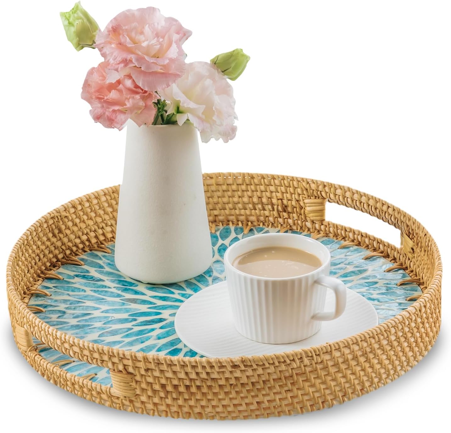 | Special Feature | Easy Carry Handles, Generous 13.8 inches Diameter, Handwoven Natural Rattan, Mother of Pearl Inlay Wood Base, Smooth, Wipe Clean Surface |
