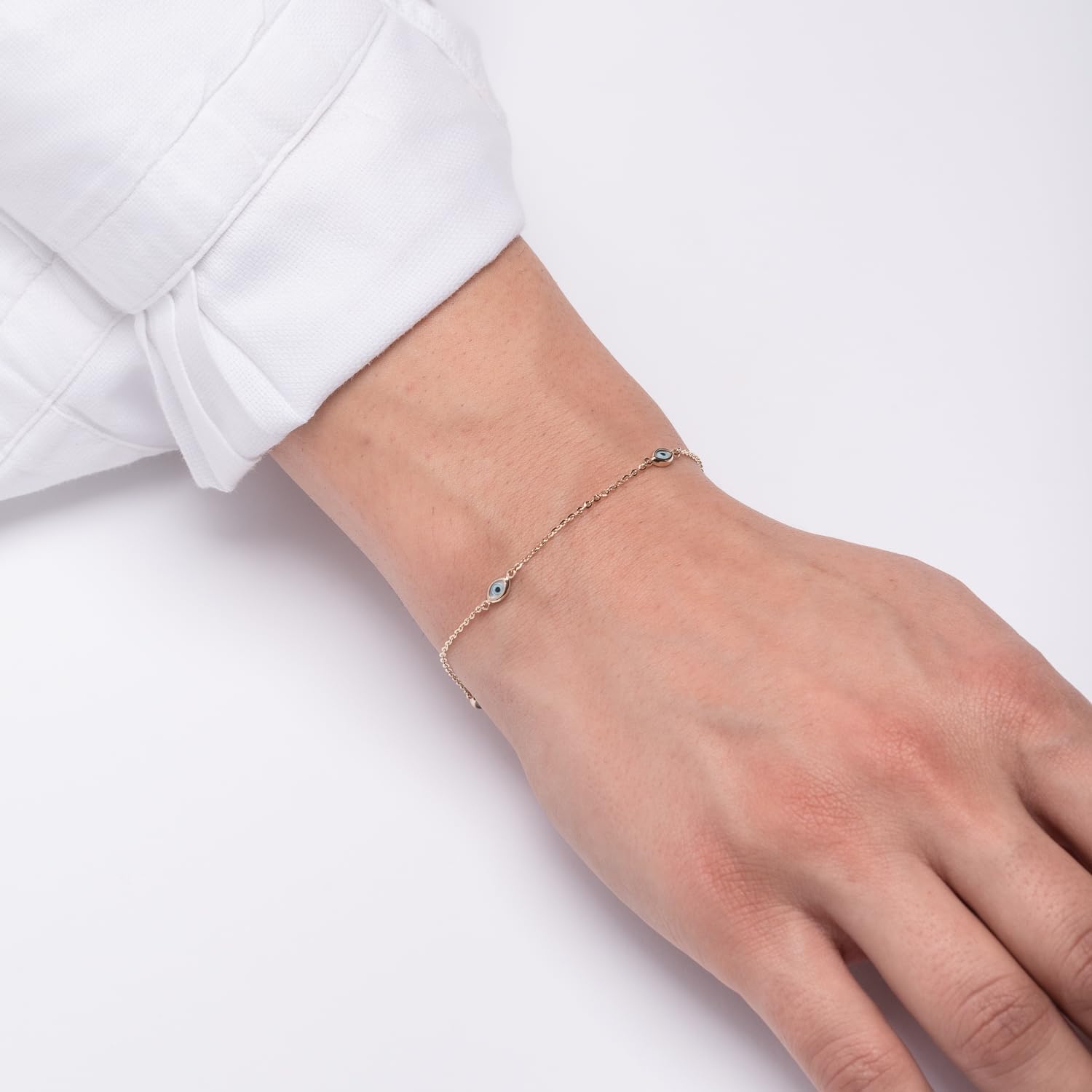 Embrace timeless elegance and positive energy with this 14k Solid Gold Oval Evil Eye Bracelet. Featuring four dainty oval charms crafted with luminous mother-of-pearl evil eyes, this bracelet symbolizes protection, good luck, and warding off negative energy. Its delicate design makes it perfect for everyday wear or as a meaningful gift for someone special.