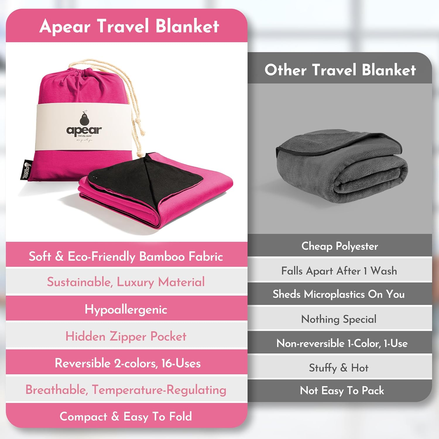 | Additional Features | Eco-Friendly Material: Sustainable bamboo—ultra-soft, temperature regulating, and cozy. Hypoallergenic & Chemical-Free: Free from parabens, BPA, and microplastics., Hidden Zipper Pocket: Safely store your valuables while traveling., Multi-Purpose Functionality: Converts into a scarf, shawl, sarong, pillow, nursing cover, or picnic blanket., Neck Snaps: Keep the blanket securely in place while sleeping on airplanes or in cars., Reversible Design: Tan/Camel on one side, Black on the other. |