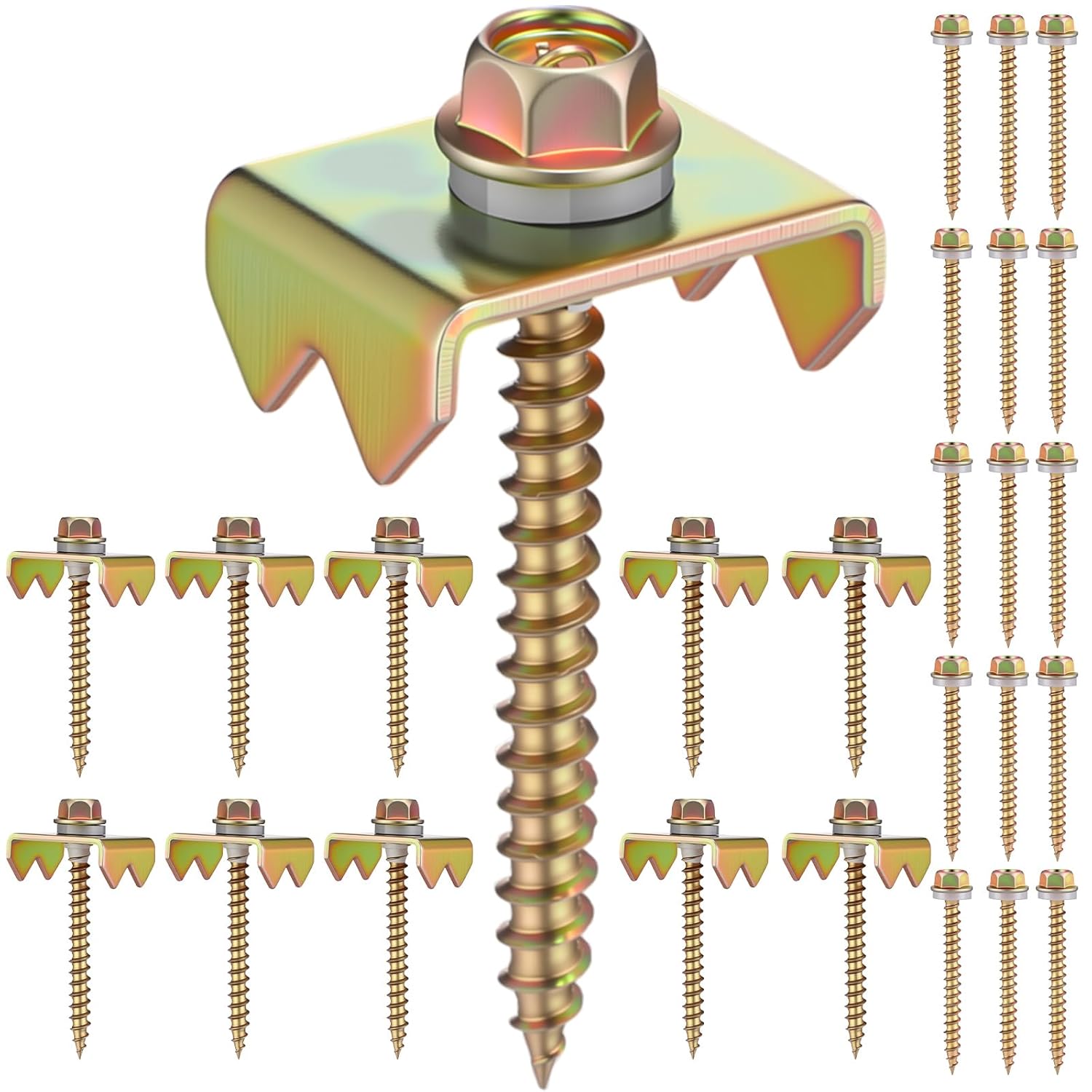 Features: Replaces The Common Wire Fence Staples: fast easy install with your favorite battery powered drill. No more smashed fingers, loose wires or hammering and pulling Material: galvanized iron Color: gold Size: 2 inch Package includes: 170 × fasteners and 170 × screws Notes: Manual measurement, please allow slight errors on size. The color may exist a slight difference due to different screen displays. Pointed items are included, please be careful when using and please keep them away from kids