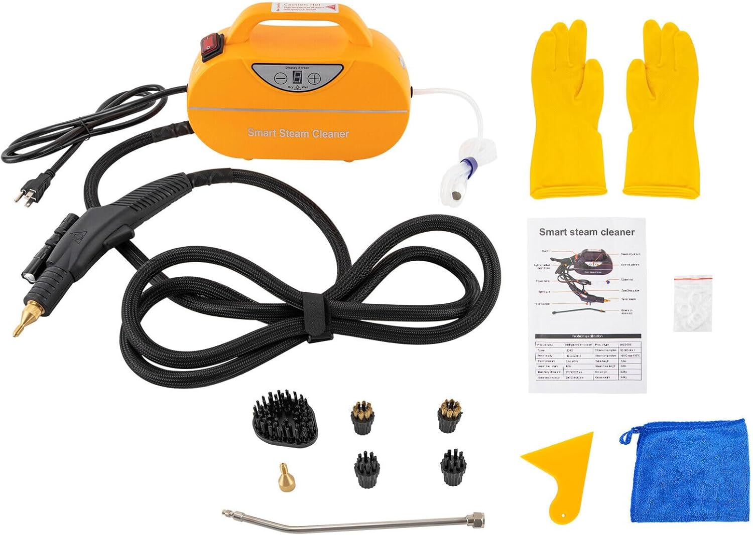 Specification Style: Modern Product type: KMG-G18 Color: Yellow PumpType: Electromagnetism Self-priming Pump Material: Aluminum, Plastic, Nylon, Stainless Steel, Copper Shape: Oval Power Source: Corded Electric Power: 1800W Plug: US Standard Voltage: 110V Frequency: 60Hz Mount Type: Free Standing Assembly Required: Yes Screen Type: LED Power Cord Length: 1.5m/59.06inch Water Inlet Length: 1.5m/59.06inch Steam Flow: 90-300ml/min/3.8-12.68oz/min Number of Gears: 3 Steam Pressure: 0.3-0.6Mpa Working Hours: >30min Maximum Water Absorption Distance: 2m/6.56ft Suitable Media: Tap water(Soft Water or Distilled Water) Steam Temperature: > 98℃, max 110℃(>204.8℉, maximum 230℉) Steam Hose Length: 3m/118.11inch Extension Tube Length: About 20cm/7.87inch Number of Items: 1 Torch Type: LED Torch Battery Type: 1*AA Battery(Not Included) Overall Size: 27.5*9.5*20.5cm/10.83*3.74*8.07inch Net Weight: 2.78kg/6.13lbs Gross Weight: 3.1kg/6.83lbs Gross Weight: 3.1kg/6.83lbs Packing Size: 38*28*26cm/14.96*11.02*10.24inch Packing Included 1*Handheld Steam Cleaner 1*Towel 1*Extension Tube 2*Gloves 1* English Manual