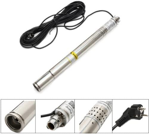 Specifications: Model:AC2202T-55 Color:Silver Material:Stainless Steel Voltage:220V AC Pump Length:62.5cm(24.61") Pump Outlet:20mm/0.79" Pump Diameter:50mm Pump Cable:10M(32.81ft) with plug Max Depth:55m(180ft) Power:370W (0.5hp) Max flow:2m³/h, 8GPM Protecting Rate:IP68 Suitable for working lift: 0-35m Working principle: Screw Pump Features: -2" deep well submersible pump, fits in the 2" well casing. -Patented impeller design provides extended pump life and heavy flow under the severe circumstances. -This pump has a much longer pump life than the all-plastic-bottom-suction pump. -Solid 304 stainless steel body with heavy duty cast iron discharge. -Industrial grade heavy duty, also good for home usage. -Built in 1/2 HP capacitor start, and thermal protection switch, for longer life and powerful start. -Built in control box. This pump Does Not require an external control box! -Heavy-duty thermoplastic impellers, diffusers, and intake screen. -Include a built in check valve. -High efficiency, hermetically sealed motor is thermally protected to prevent overheating, and uses less energy. Submersible design eliminates the need for priming and creates quiet operation.