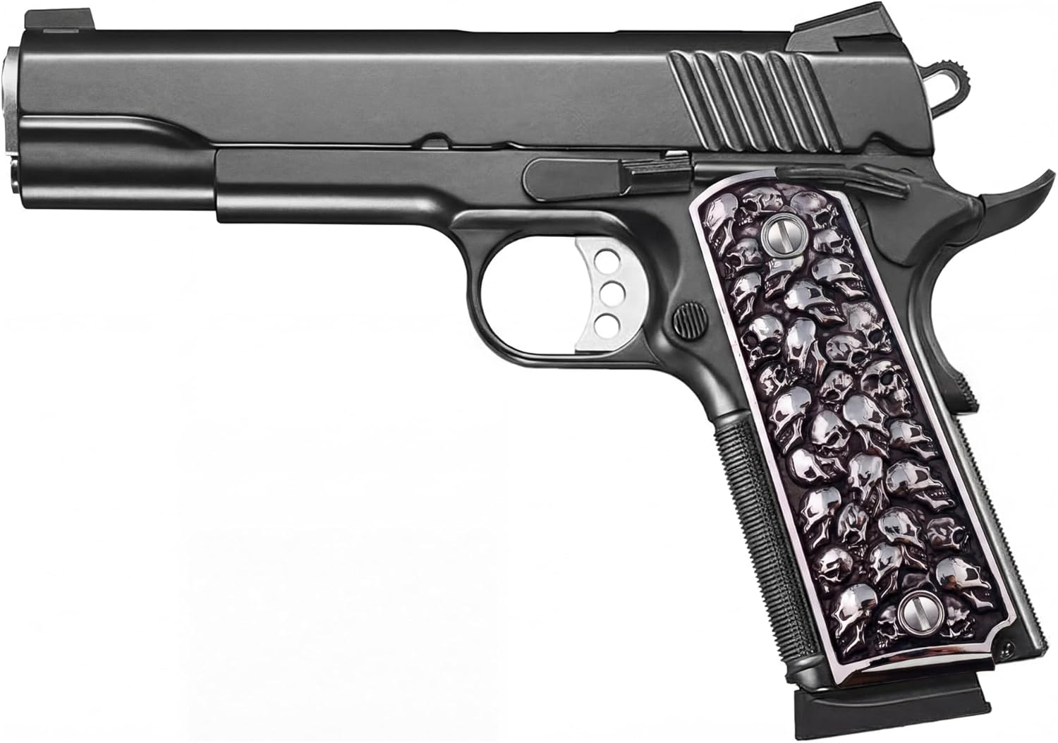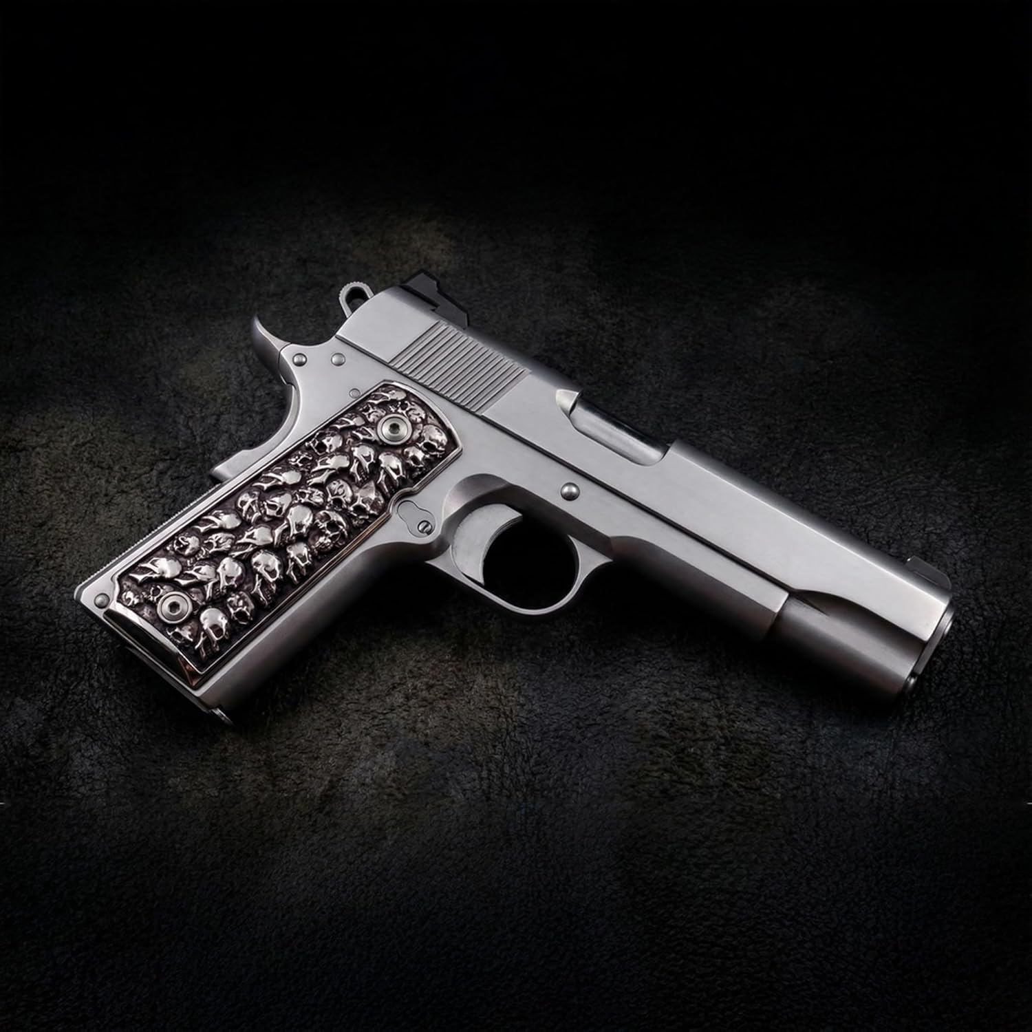 CUSTOM MADE FROM aluminum alloy, finished to look and feel like pewter. These are EDC (every day carry) grips. These fit any 1911 without ambi safety. Springfield, Rock Island, Taurus. Kimber, Remington, Sig, Smith & Wesson and other Colt Govt. and Colt Govt. clones these work great with countless versions out there. Can be used with or without standard bushings. No bravado or bluster these are excellent grips.