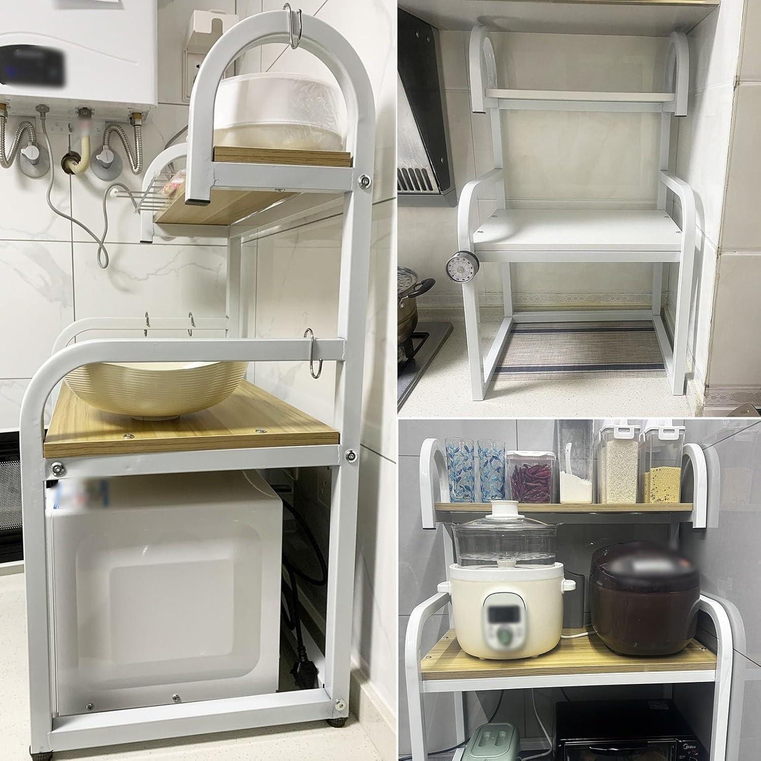 2 Tier Microwave Oven Shelf Countertop Multifunctional Household Shelf Applicable Microwave Oven ShelfProduct Name: Microwave Oven ShelfMaterial: carbon steelSize: 50*40*82cm , 60*40*82cmColour: white/walnutFeatures: increased volume, space-saving, strong load-bearing capacityPackage Includes1 x Microwave oven rack3 x Hooks4 x Non-slip feetWarm tips:As the product is measured manually, there may be 1-2cm error, which is normal range and does not affect normal use, please feel free to buy.If you have any questions, please feel free to contact us by email, we will reply you within 24 hours and provide you with the best service.