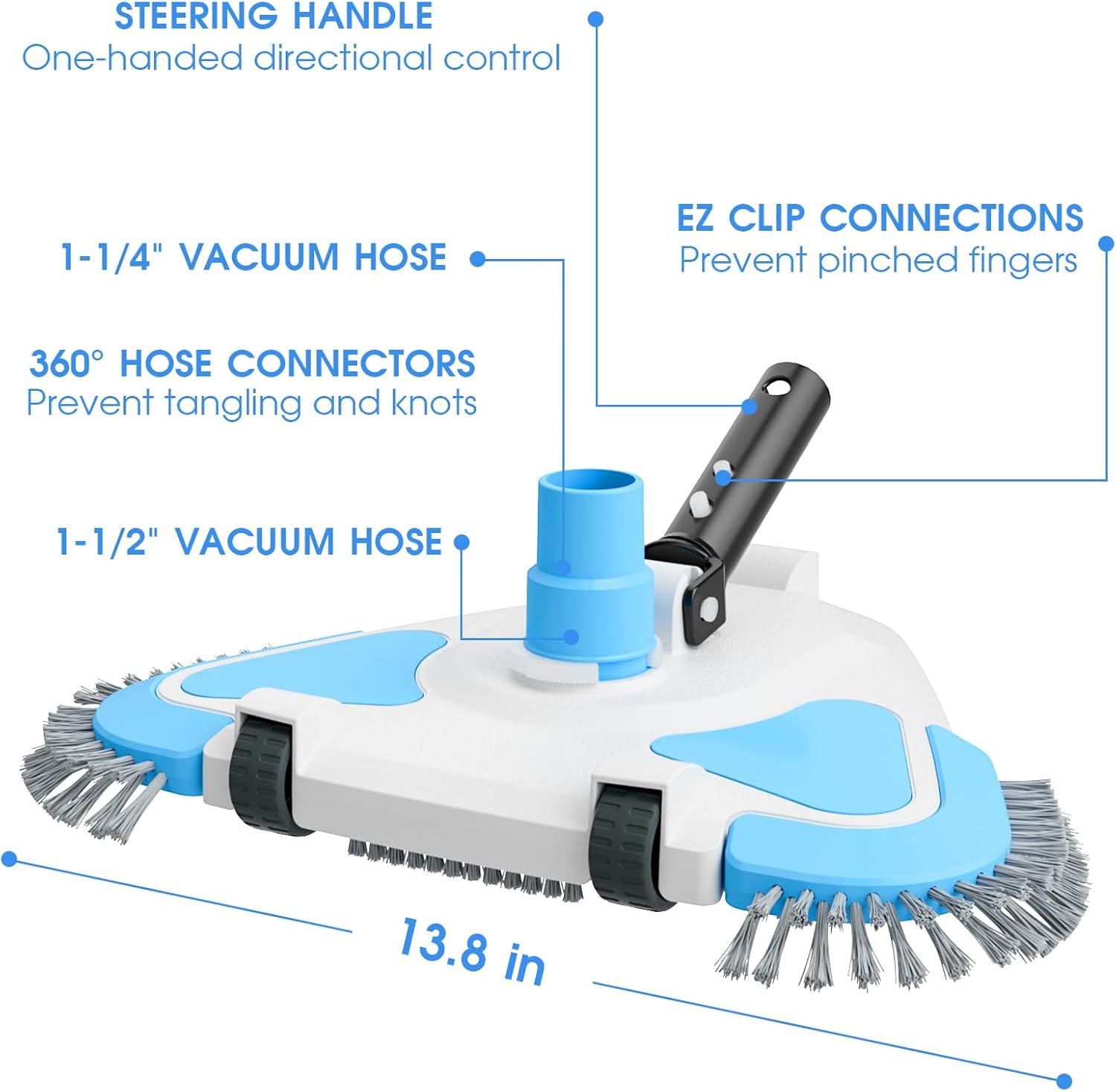| Key Product Features | Collision-Avoidance Wheels Design: TidyMister vacuum head features non-slip wheels for smooth pool surface movement, preventing damage during cleaning. Even with brush wear and shortening, the wheels maintain smooth movement, Complete Cleaning Technology: The 8 strategically placed bottom and corner brushes guarantee a comprehensive clean in every corner and crevice, Ease Around Obstacles: The rotatable hose and adapter facilitate easy navigation around obstacles. Compatible with 1-1/4" or 1-1/2" diameter hoses and standard pool poles (Note: hoses and pole not included), Easy to Fit Pole: Effortlessly attachable to standard pool poles, our pool vacuum head features an EZ CLIP handle for easy fittingFor assistance, reach out to us anytime, Single-Handed Direction Control Prevents Flipping:The universal handle and weighted design provide single-handed control,cutting effort by 80%,keeping the vacuum head grounded for a complete clean without uncontrolled flipping |