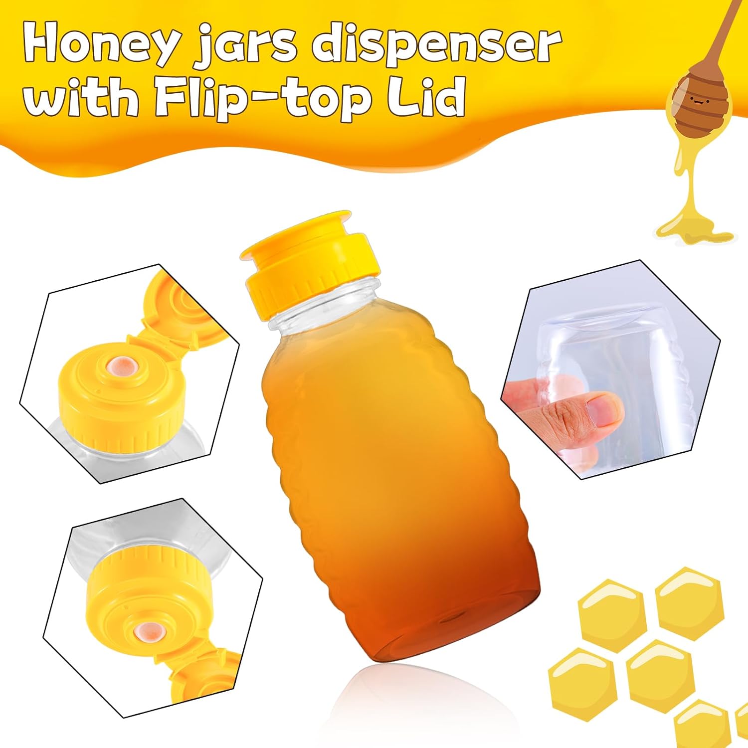24pcs 12oz plastic honey jars Each clear honey container is made of high quality PET plastic, BPA free, food grade material for peace of mind. It can be cleaned and reused after use package:24pcs capacity:12Oz size:2.72"x2.2"x5.24"(L x W x H)