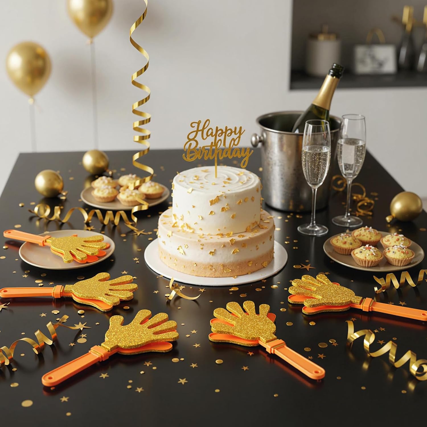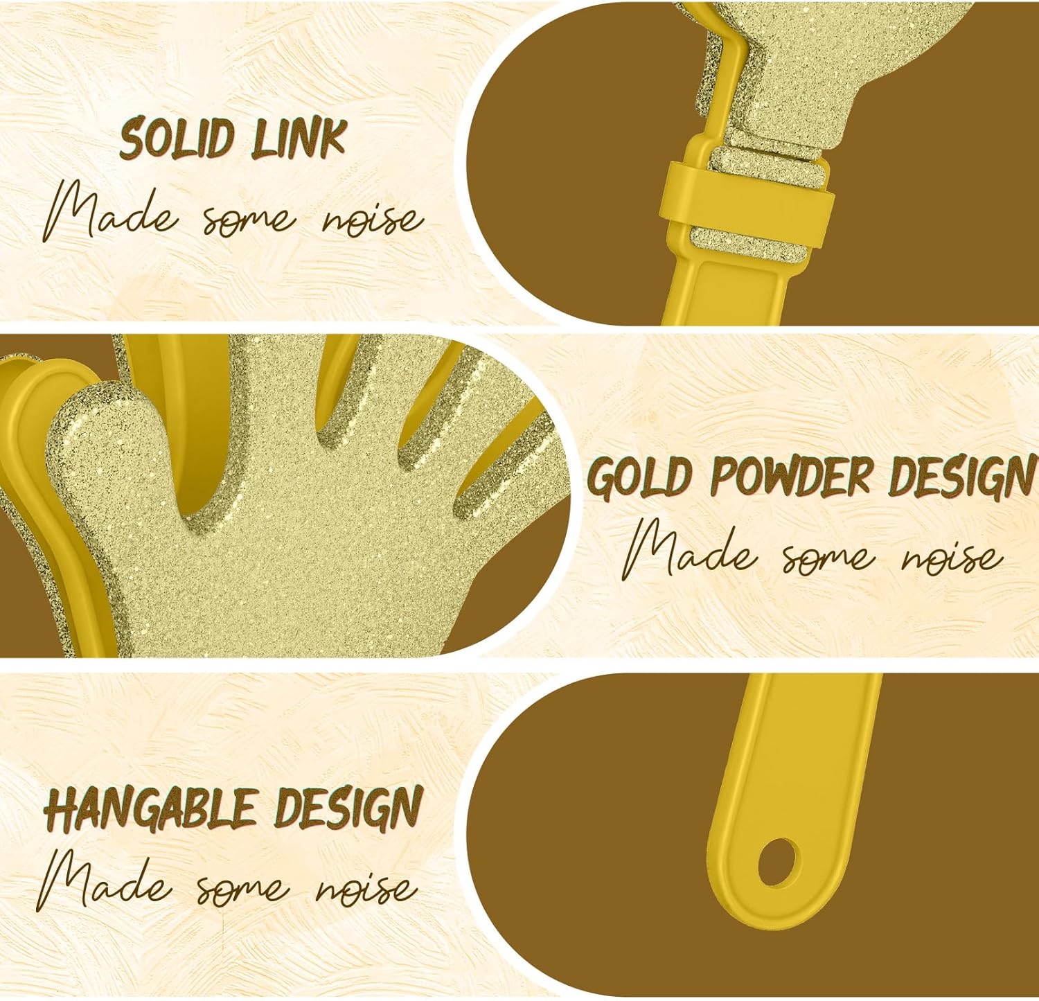 "Features: Party gift:Plastic noise makers can keep making noises, nice as gifts for your family, sports fans, and someone who like to hold party to make fun memories together Funny gift: You can give these party noisemakers to your family members, relatives, friend, classmates or colleagues on various occasions, and they will be delighted to receive such interesting gifts." Specifications: Material: Material: plastic Size: about 19 cm/ 7.5 inches long and 9 cm/ 3.5 inches wide Package includes: 24 x gold hand clappers Color: Gold Notes: Manual measurement, please allow slight errors on size. The color may exist a slight difference due to different screen displays. Suitable for people over 15 years old.