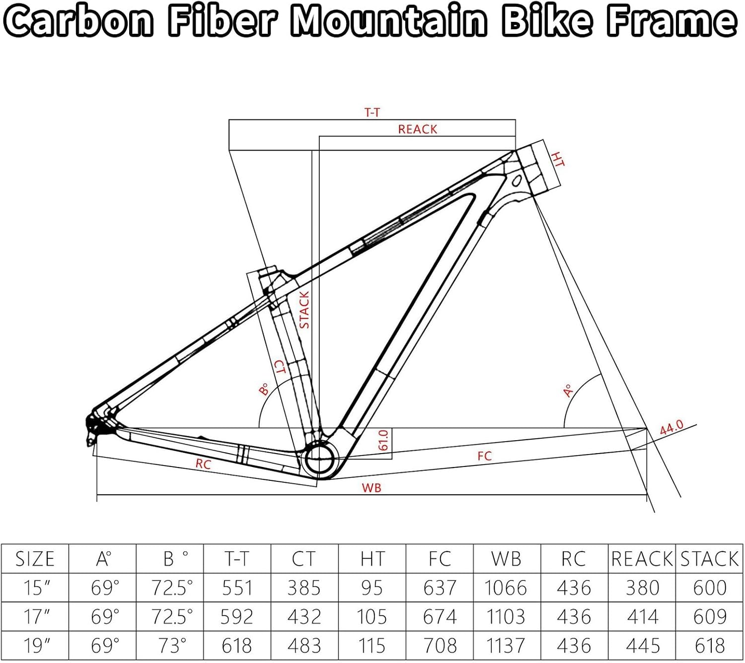 Carbon Fiber Mountain Bike Frame 27.5er 29er XC Hardtail Bike Frame 15''/17''/19'' Quick Release/through axle Frame Disc Brake Routing InternalProduct Name: Carbon Fibre Mountain Bike FrameSizes: 27.5-inch / 29-inch * 15-inch / 17-inch / 19-inchColour: BlackMaterial: Carbon FibreSpecifications: Compatible with 42*52 tapered headset + BB92*41 press-fit bottom bracketSeat Tube: 31.6mmClamp: 34.9mmQuick Release: 135mmDropouts: 12x142mm / 12x148mm, compatible with front derailleur pullConstruction: XC-grade, EPS, internal cable routing, hidden disc mountsWeight: Approx. 1.18kg (29 x 17in)Package: FrameNotice:1. Due to different shooting angles, there will be chromatic aberration problems, because there will be 1-2cm error due to manual measurement, please understand.2. If you have any questions, please feel free to contact us, we will reply you in time.