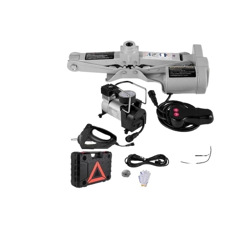 Product Description3 Ton Electric Scissor JackThe electric scissor jack's load capacity can reach up to 3T/6600 lbs, and two removable raised heads are designed for Sedan and SUV, which can meet your multiple needs. The electric wrench can remove screws and quickly replace tires. The car jack kit is an indispensable helper for garages, farms, highways, and long-distance trips. It is very suitable for emergency roadside tire replacement.Large Loading CapacityAutomatic & Labor SavingElectric Wrench InflatorProfessional Tool BoxTough Equipment Tools Pay LessKey Features3T6600LB Lifting CapacityThe electric jack for car has a maximum lifting weight of 3 tons 6600 pounds and a lifting height range of 1742 cmSUV) / 12-37 cm(Sedan). for sedan and SUV. Before the operation, park the car on the flat ground, avoid car move.Automatic JackingWith the simple remote control, the electric floor jack is easy to operate. It can automatically rise and fall and reach up to its maximum value in minutes, saving time and effort, for dealing with a flat tire, and an essential repair tool.Electric Impact WrenchThe impact wrench can easily and quickly remove the tire screws, and it can be used after connecting to the 12V car power supply. Very suitable for emergency roadside tire replacement. Say goodbye to tedious manual disassembly.Easy-to-use Inflation pumpThe inflator has a built-in high-power motor, which can easily and quickly fill the tires, avoiding that the spare tire cannot be replaced when the car is jacked up in an emergency. It takes about 1-3 minutes for a standard empty tire.Multi-function ToolboxThe red triangle warning sign outside the box can be used as a warning road sign when changing the highway's tires. Each part has its position, and they can be precisely embedded in the box. The compact case design is very space-saving and comfortable to carry.Well-constructed Jack