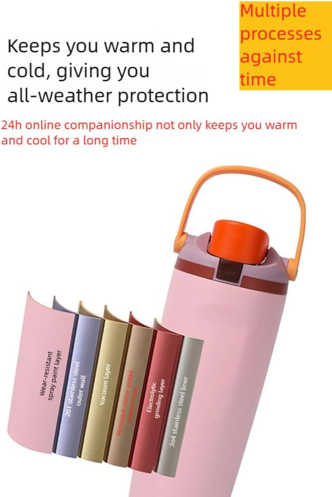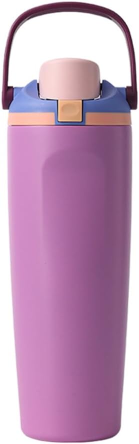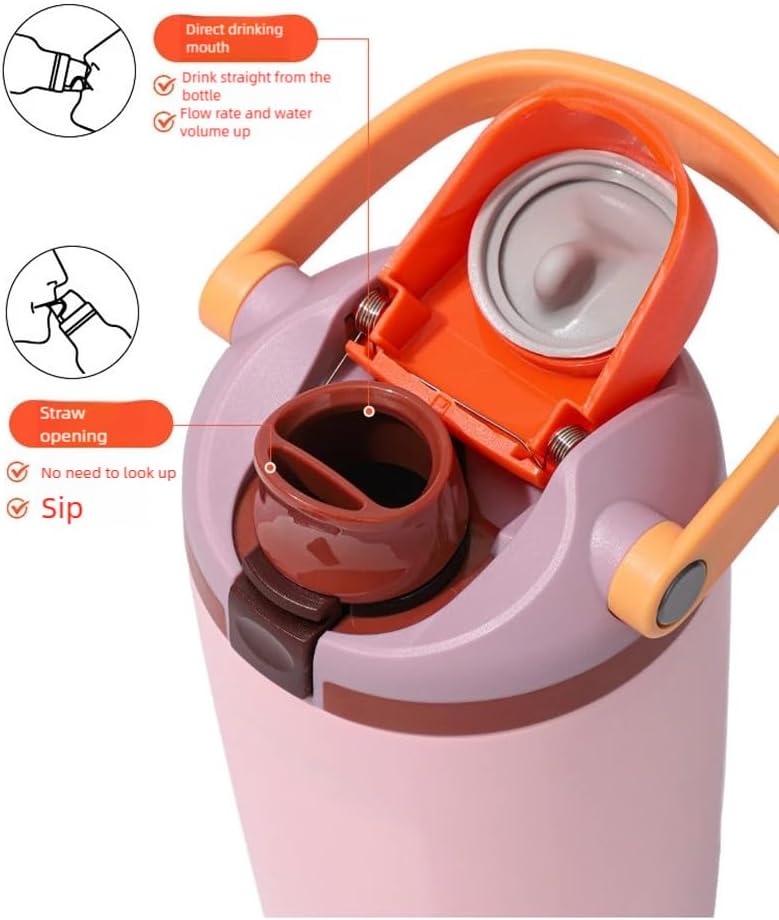 This 30 oz large-capacity tumbler with a handle is your ideal companion for daily commutes and outdoor adventures. Crafted from high-quality 304 double-wall stainless steel, it features a secure locking clip and a high-performance sealing ring to ensure 100% leak-proof performance, even when shaken. The removable lid allows for easy and thorough cleaning. A non-slip, textured base keeps it stable on surfaces. The exterior is coated with a wear-resistant finish, and it's versatile enough to hold various beverages like coffee, milk, tea, and soda without retaining odors. The unique dual drinking openings cater to different preferences. With excellent 24-hour heat retention and cold insulation, enjoy your drinks at the perfect temperature anytime, anywhere. The comfortable carry handle makes it incredibly portable