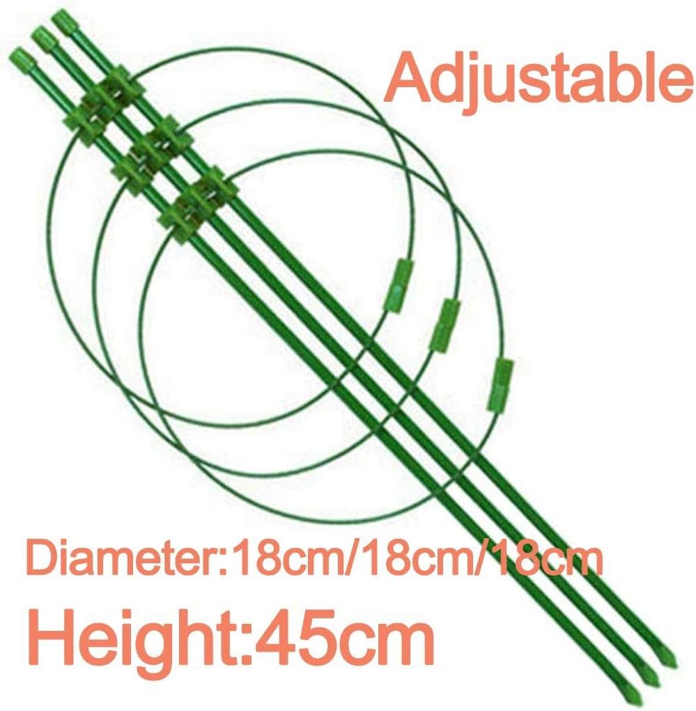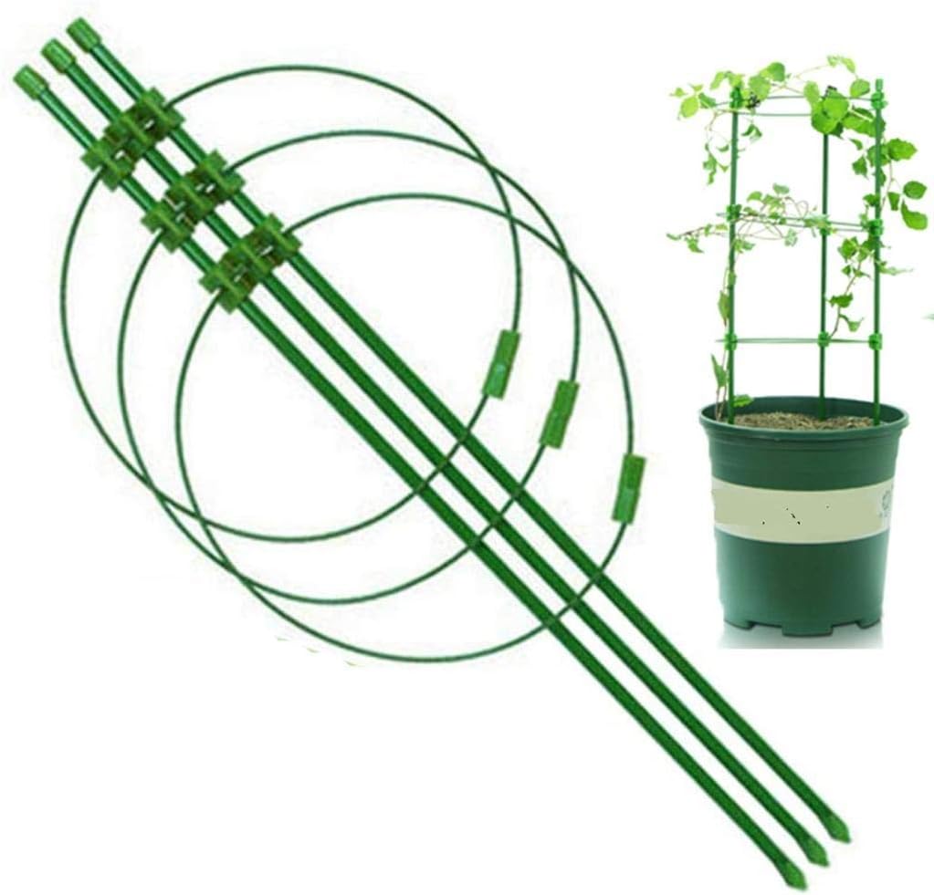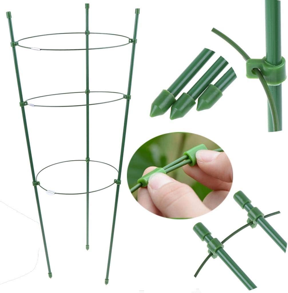 Adjustable Design:The three rings are different in size and can be adjusted freely,in line with the actual growth principle and provide better support. Can be stacked for better storage and reuse. DURABLY BUILT:Made of strong,powder-coated wrought iron,Rugged and tall,these cone shaped wire cages can support large tomato plants and other vine or bushy. Designed For Small Plants:Support flowers and leaves growing,avoid to fall and break off,conveniently to keep your plants growing healthily.Pot and plants are not included in the item. Easy to use:Adjusts your needs with different ways to assemble it.Just stick trellis into the ground or secure the trellis onto a wall, fence or near a pot.What you get:4 Packs Garden Climber Shelf Flower Racks,6 Pcs clear Watering Device Globe and 20 Pcs plant clips . Easy To Install:The vine plants rack no need to disassemble the assembly, just rotate to the right angle and position.Continuous support throughout the plant's growth Strong steel core stakes.