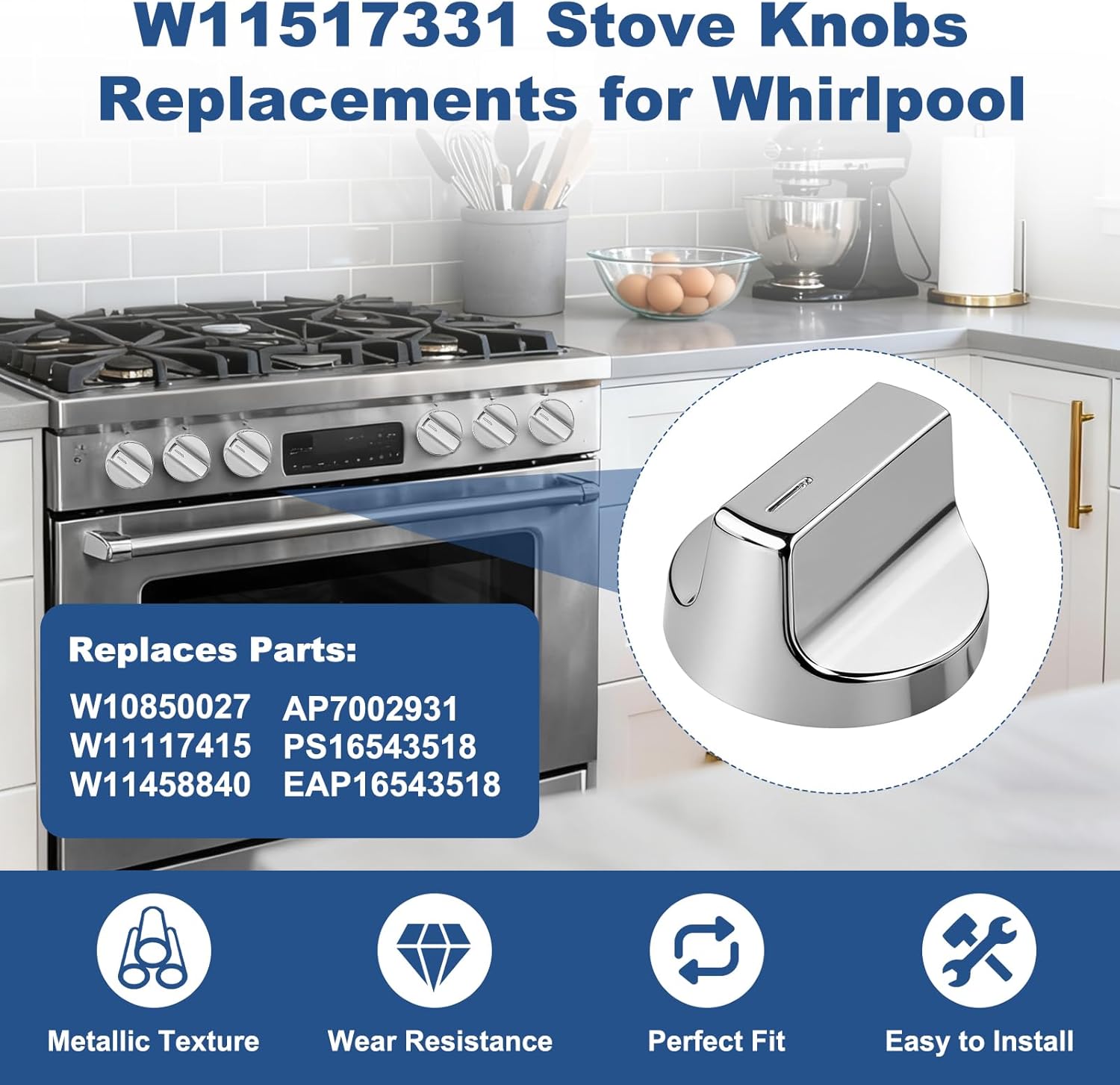 Perfect Fit: Restore your appliance's control with our exact-replacement knobs! Seamlessly compatible with a wide range of Whirlpool models including whirlpool WEC310S0LS1, WEE515S0LZ1, WEC310S0LS2, WEE515S0LS1, WEC310S0LS3, WEE515S0LZ2, WEE515S0LS2, WEE515S0LV0, WEE515SALS0, WEE515SALS1, WEE515S0LS0, WEC310S0LS0, YWED745H0FE0, YWED74580FH0, YWHE975H0FS0 and more. Durable Construction: Built to last with a sturdy stainless steel core and a thick, solid collar. This premium material resists heat, wear, and deformation, ensuring your knobs look and function like new for years. The smooth surface wipes clean effortlessly. Tool-Free Installation: Regain control in seconds—no tools needed! Simply pull off the old, worn knobs and press these new ones firmly into place. Our design ensures a perfect, snug fit every time, saving you money on service calls. Replace part numbers: This W11517331 stove knob is the direct replacement for part numbers W11117415, W10850027, W11458840 AP7002931, PS16543518, EAP16543518. Designed to match the original specifications precisely, offering the same reliable performance and familiar feel for your electric range or stove. Satisfaction Guaranteed: We stand behind our product with full confidence. Your satisfaction is our priority. If anything isn't perfect, reach out to our support team for a prompt solution, ensuring a completely risk-free purchase.