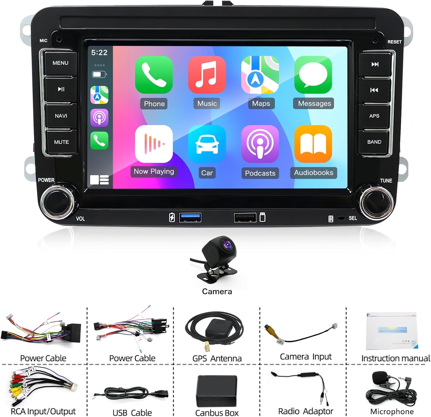 | BuiltIn Media | 1*AHD Backup camera/ 1*Microphone/ 2*Power cable/ 1*Camera input/ 2*USB cable/ 1*GPS antenna/1* Instruction manual/ 1*Canbus Box/ 1*RCA imput/output/1*Radio adapter |