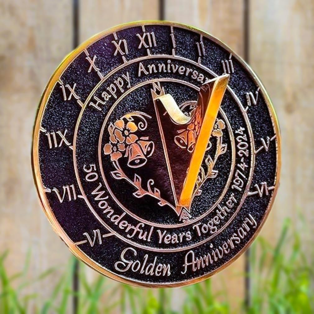 50 Wonderful Years Together, What a Gift. To Match that opt for a Solid Brass Golden Anniversary Sundial Gift Handmade. Grab the Gift Everybody will wish they’d found first. Your Garden's Decor Brass Classic Sundial are hand Carved to order as they are designed to be site Specific. The designs are large and Impressive. High Quality thick Brass, Our Craftsmen Combine Simplicity, Elegance and durability into every single Sundial and for this 50th Wedding Anniversary Version, They finished it in Black. Measuring: 6.4" across by 3" high. (Stand Not Included) ‘Happy Anniversary. 50 Wonderful Years Together 1974-2024. Please see that the order you placed is from Online Solution inc.