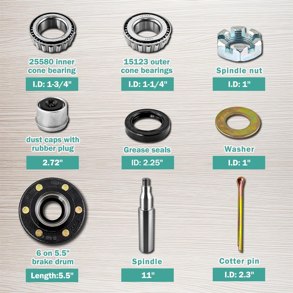 JADODE 5200 to 6000 lbs Trailer Idler Hub Kit with 6 on 5.5" Bolt Idler Hub & Round #42 Spindle Trailer Axle 2pcs 6 on 5,5" trailer hub, 2pcs 25580 inner bearings(1-3/4”I.D), 2pcs 15123 outer bearings(1-1/4”I.D), 2 pc 2.250” I.D grease seal, 2 pc 2.125” I.D grease seal, 2 pc E Z lube 2.44” grease cap, 2 dust cap plugs, 12 pcs cone wheel nuts 1/2”-20 thread. 2pcs 5200-7000 lb trailer axle spindle 2pcs cotter pin 1 pc spindle nut 2 spindle washer