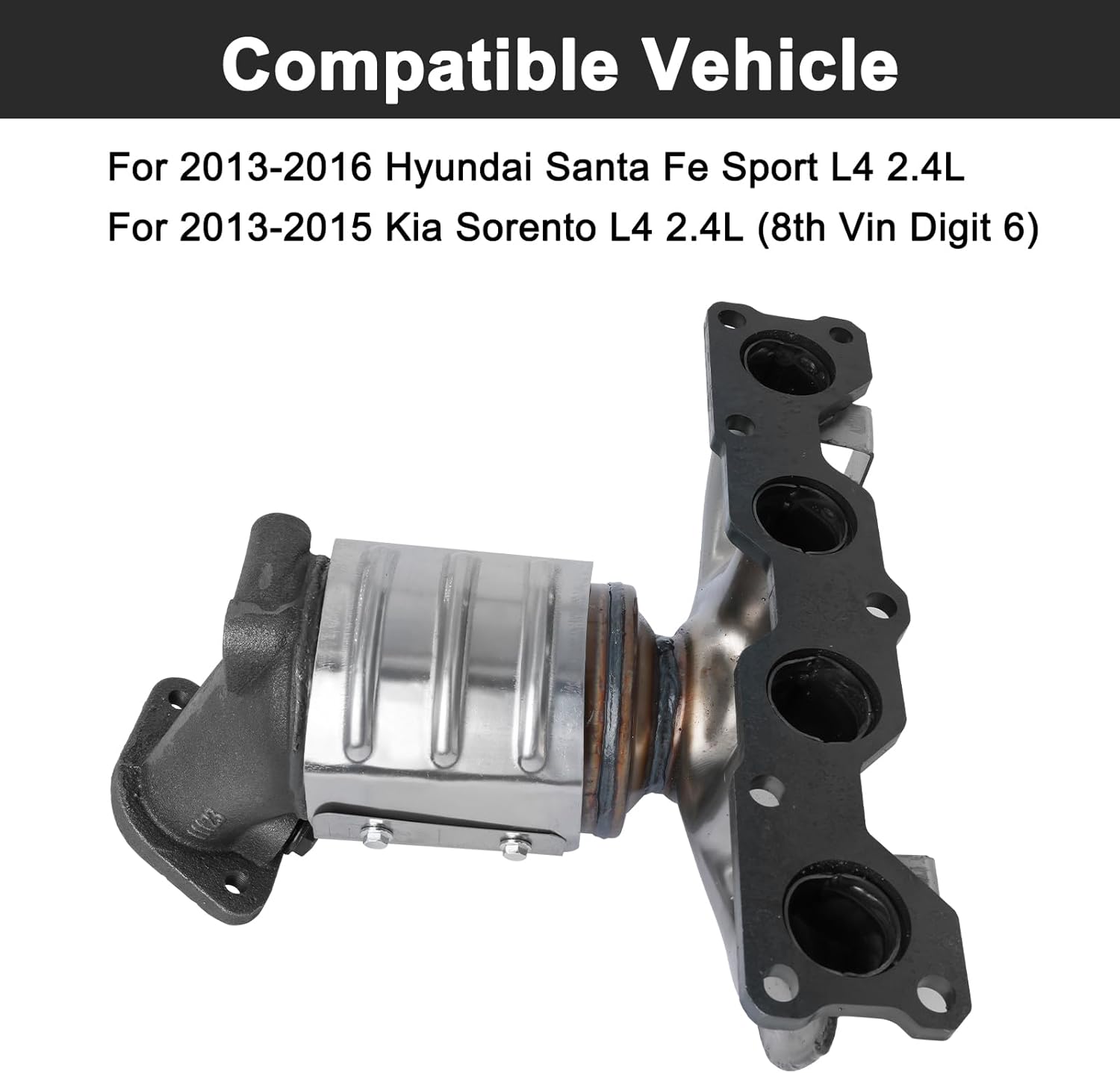 Product SpecificationsProduct Name: 674-071 Front Manifold Catalytic ConverterReplaceable Part Numbers: 285102G445, 674-071, 674071, 52775, 28510-2G445Compatibility:This catalytic converter is suitable for 2013-2016 Hyundai Santa Fe Sport L4 2.4L; for 2013-2015 Kia Sorento L4 2.4L (8th digit of the vehicle identification number is 6)Note:This product is not legal for sale or use in California, Colorado, New York and Maine (Cannot ship to CA, CO, NY or ME) due to state emissions regulations.Please confirm your product model and OE number before purchasing