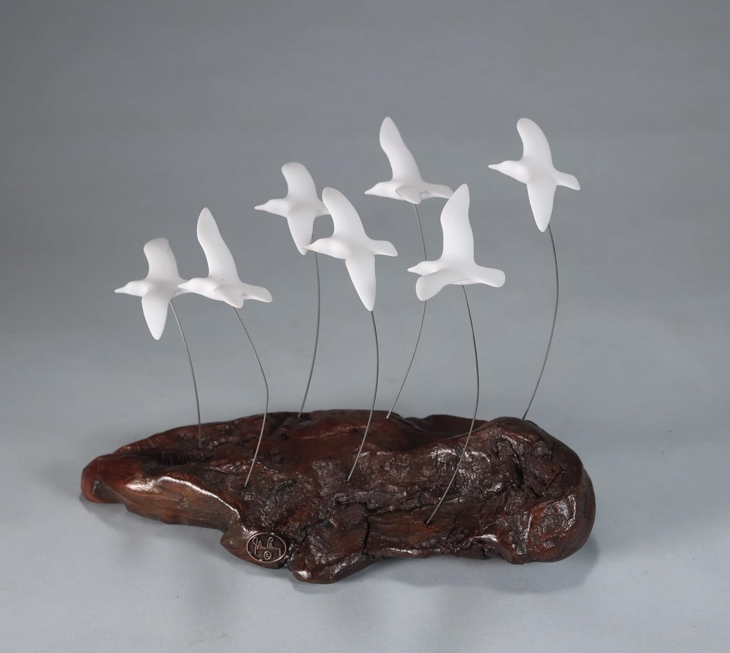 These seven miniature gulls soar above a polished burlwood base They are made of Pellucida our proprietary resin compound that resembles Bisque porcelain but is more durable. The piece stands about 7 inches high and 5 inches wide. Each gulls wingspan is about 31/2 inches. PLEASE NOTE; the photos are of illustrative samples. Each burl is a unique piece of nature's art, so the one you will receive will be different but of similar size and comparable beauty. It is SIGNED and comes with a CERTIFICATE OF AUTHENTICITY.