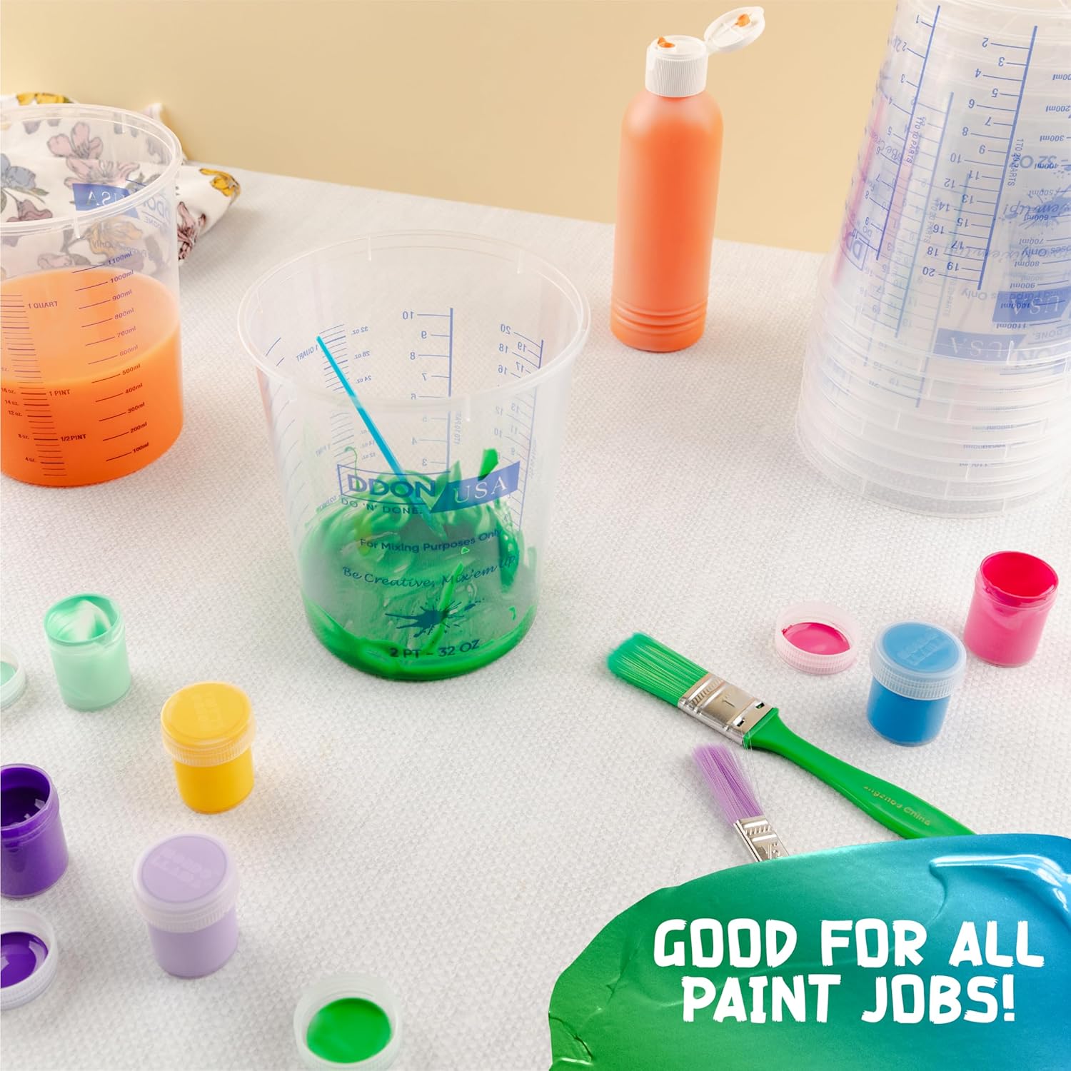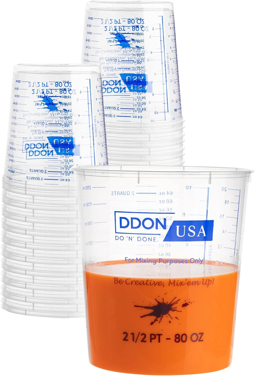 These paint mixing cups are great for artists, painters, DIYers, and professionals. They are perfect for mixing small amounts of paint, resin, epoxy, and other art and craft materials. The cups are disposable and made from high-quality plastic that is durable and leak-proof. Each cup has measuring ratios marked on the side, making it easy to measure and mix the correct proportions of materials. The clear design allows you to see the contents of the cup, so you can ensure that you have the right amount of material for your project. These cups are an affordable and convenient option for anyone who needs to mix small amounts of materials. They are perfect for small projects, and they can also be used for larger projects by simply pouring the mixed materials into a larger container. Overall, these paint mixing cups are an excellent choice for anyone who needs a reliable and convenient way to mix small amounts of materials.