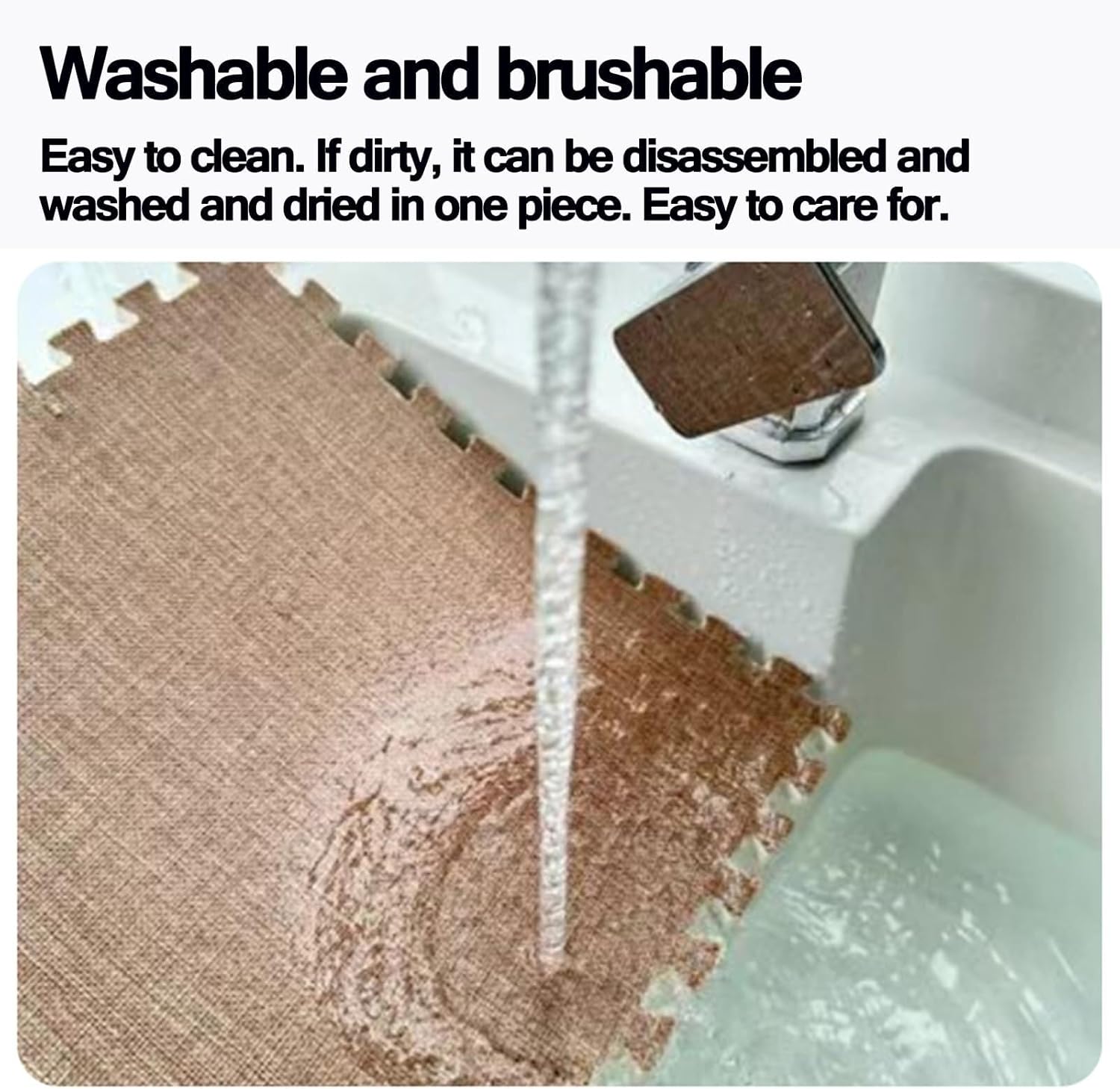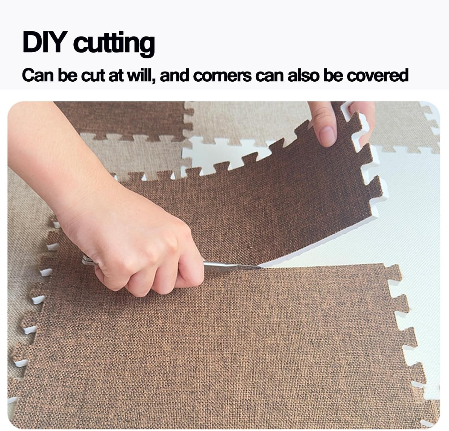 Square Soft Fluffy Tiles with Border Play Mat Protective Floor for Children Kids Room Home Parlor BedroomProduct name: EVA foam puzzle padMaterial: Cotton Linen fabric on the surface, EVA on the bottomFeatures: can be cut, spliced, and wash-freeSpecifications: 60x60x1cm/anti-slip pattern design on the bottomApplicable scenarios: bedroom, living room, balcony, bay window, study, studio, gym, yoga room, etc.Includes:9x foam carpets