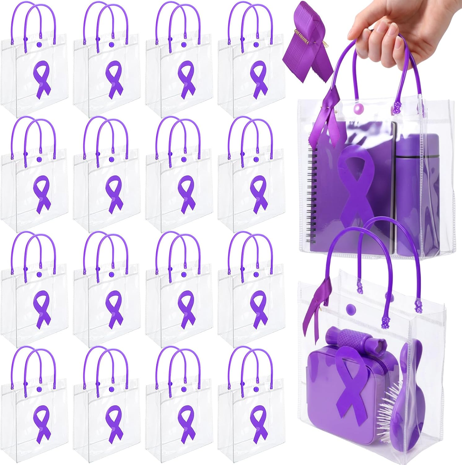 Features: These reusable totes are not just practical accessories. They are powerful symbols of hope and solidarity in the fight against breast cancer. Each tote features prominent pink ribbon motifs, making them ideal for breast cancer awareness campaigns, charity events, and fundraisers. Specifications: Material: PVC, mainly polyester, metal material Color: clear, pink Size: Gift Bags: about 6.3 x 6 x 2.8 inches/16 x 15 x 7 cm Ribbon: about 3 x 2.6 inches/7.6 x 6.6 cm Package includes: 50 x Breast Cancer Awareness Gift Bag 50 x Pink ribbon with pin Notes: Manual measurement, please allow slight errors on size. The color may exist a slight difference due to different screen displays