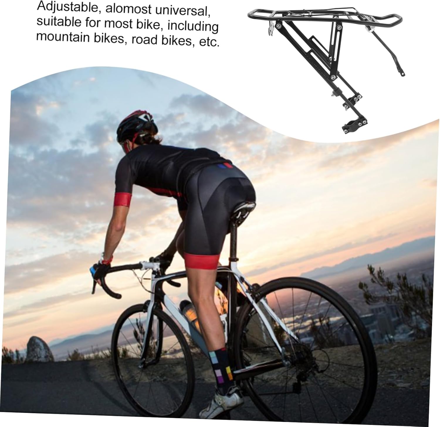 Package Include 1 x Bike cargo rack Characteristics - Material: Aluminum alloy rack rear. - Size: About 38.5x14.5x1 cm bike cargo rack. - Color: Black cycling rack. - Well made of and sturdy aluminum alloy, heavy-duty, durable for long hours cargo rack. - for use with panniers, backpacks, baskets, etc rack. - Easy installation and removal luggage rack. - Adjustable, alomost universal, suitable for most bike, including mountain bikes, road bikes, etc.Goods Informationluggage rack Are you looking a rear cycling rack? This cargo rack might be a choice for you! Made of alloy, it is heavy-duty and durable for long-lasting use.rack rear It is suitable for most bikes and for use with panniers, backpacks, baskets, etc.rack A and helpful companion for cycling!