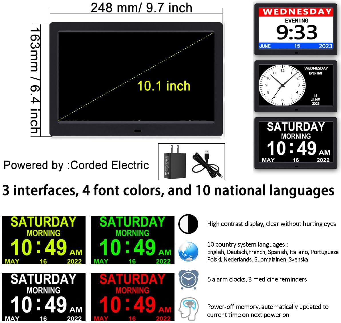 | Additional Features | Adjustable Brightness, Alarm, Auto Dimmable, Calendar Display, Large Display |