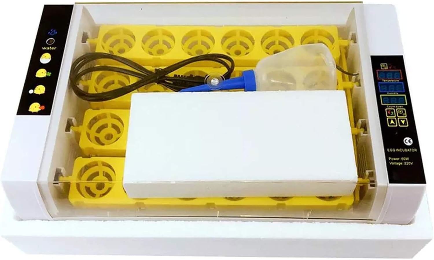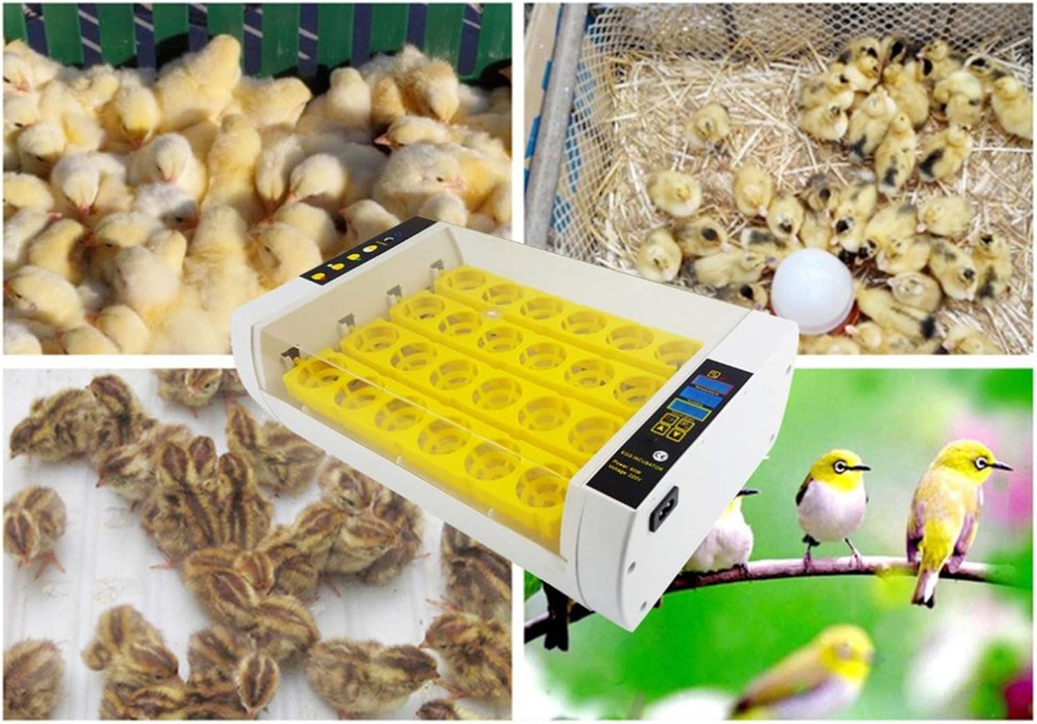 Features:1.Energy saving and environmental protection: ABS environmentally friendly materials.2.With intelligent PDI system: display, automatic egg turning.3.Applicable poultry: chicken, goose, donkey, duck, pigeon, other.Descriptions:1.This is a egg incubator, intelligent hatching machine.2.A practical household hatching tool.Specifications:Material: ABSProduct size: 45 * 17 * 29Color: yellowCapacity: eggs * 24Voltage: AC110V / 220VFrequency: 50-60HZTemperature control range: 18-39.5 degreesPackage includes: 1 x Egg incubator