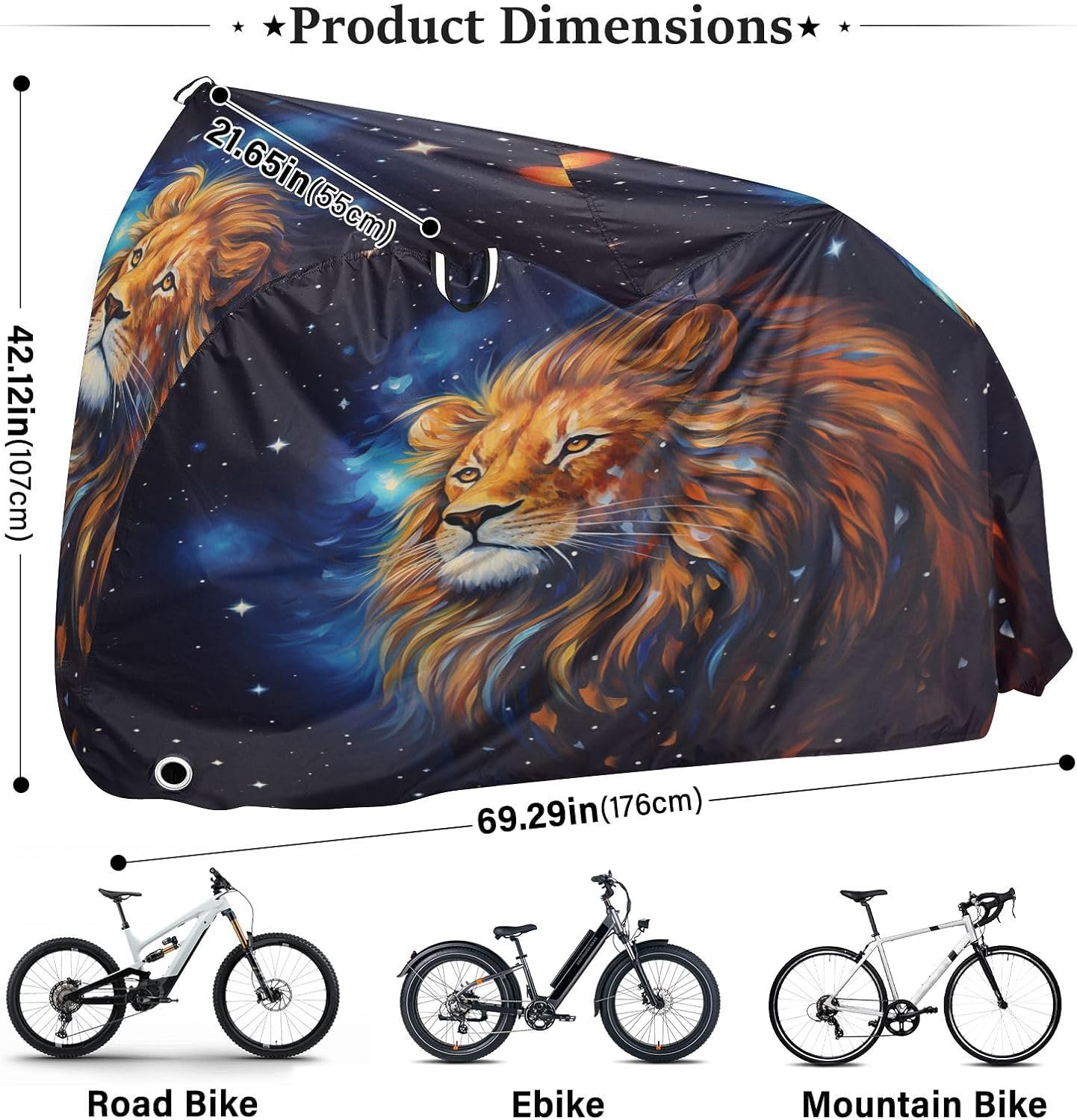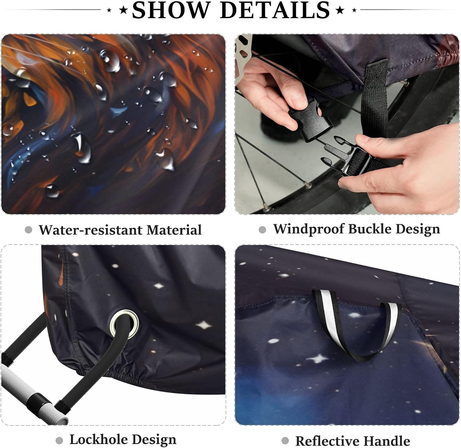 Protect your bicycle in style with our premium bike tarp, engineered for maximum defense against harsh elements. Unlike basic covers, we use specially engineered umbrella waterproof fabric - the same advanced material used in high-end rain umbrellas - delivering superior performance with unique visual appeal. Sun & Heat Defense Our fabric creates a physical cooling barrier that actively lowers your bike's temperature by: Blocking 95%+ harmful UV rays to prevent paint fading Providing exceptional shading & heat insulation (up to 20℉/11℃ reduction vs direct sun) Offering SPF 50+ equivalent protection for sensitive components Rain & Dust Protection Water-repellent coating causes rain to bead and roll off Tightly woven fabric acts as dustproof barrier for long-term storage Prevents moisture buildup with breathable side panels (prevents condensation) User-Focused Design LOCK ACCESS HOLE at front wheel enables secure locking without removing cover ADJUSTABLE BUCKLE STRAP at rear wheel anchors cover during strong winds Reflective safety strips on handles enhance nighttime visibility Ultra-lightweight (23 oz) folds into included pouch Unbeatable Aesthetics Choose from over 1,000 designer patterns - from sleek geometrics to vibrant nature motifs - transforming your bike into a street-style statement while competitors offer only solid colors.
