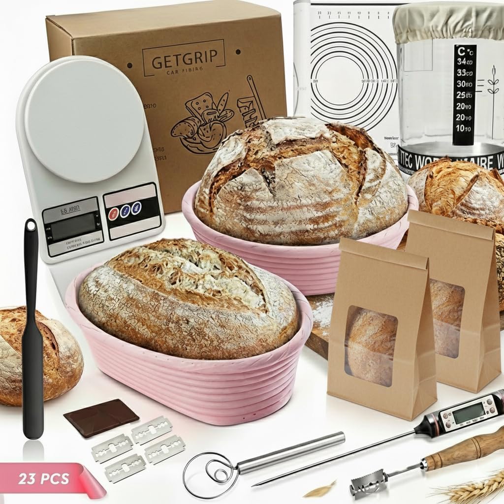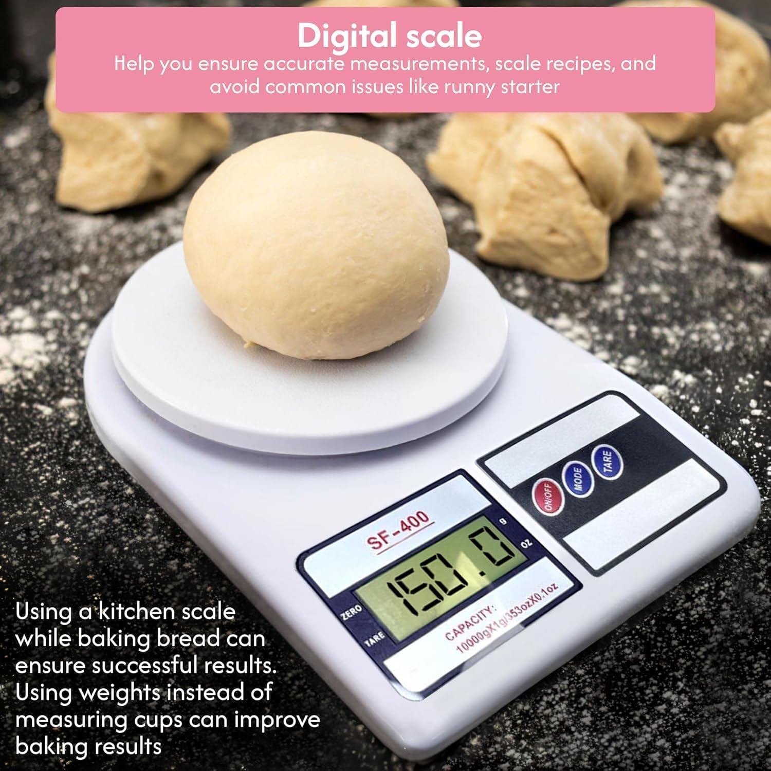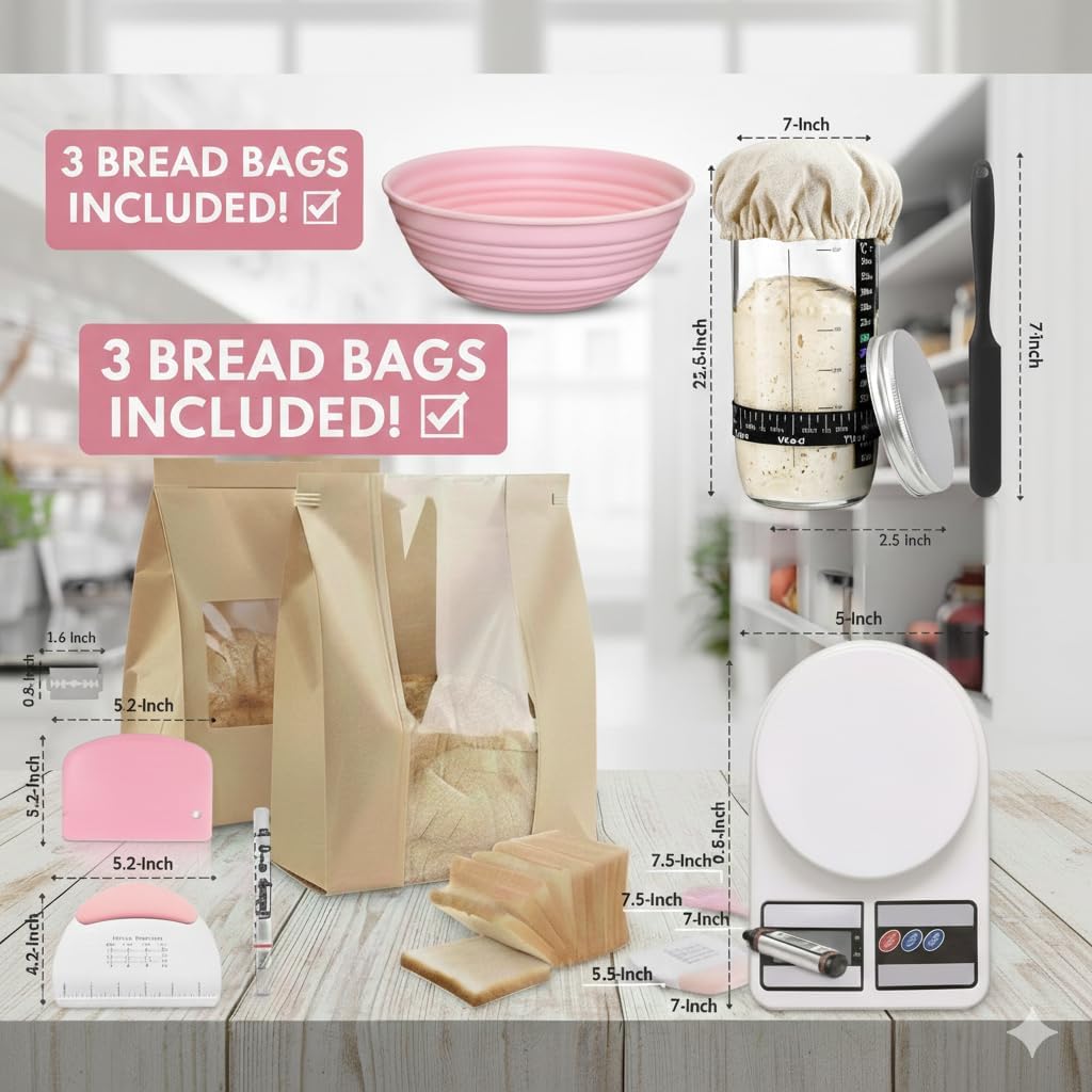 | Included Components | 1ร Digital Kitchen Scale 2ร Proofing Baskets (Round & Oval) 1ร Glass Sourdough Starter Jar (~34 oz / 1L) with Lid 1ร Danish Dough Whisk 1ร Silicone Baking Mat with Measurements 1ร Bread Lame with Replaceable Blades 1ร Metal Bench Dough Scraper 1ร Flexible Dough Scraper 1ร Cleaning Brush 1ร Plastic Jar Lid 2ร Rubber Bands (starter level marking) 1ร Bread Clip 3ร Reusable Bread Bags (Eco-Friendly & Breathable), Premium Bread Making Accessories |