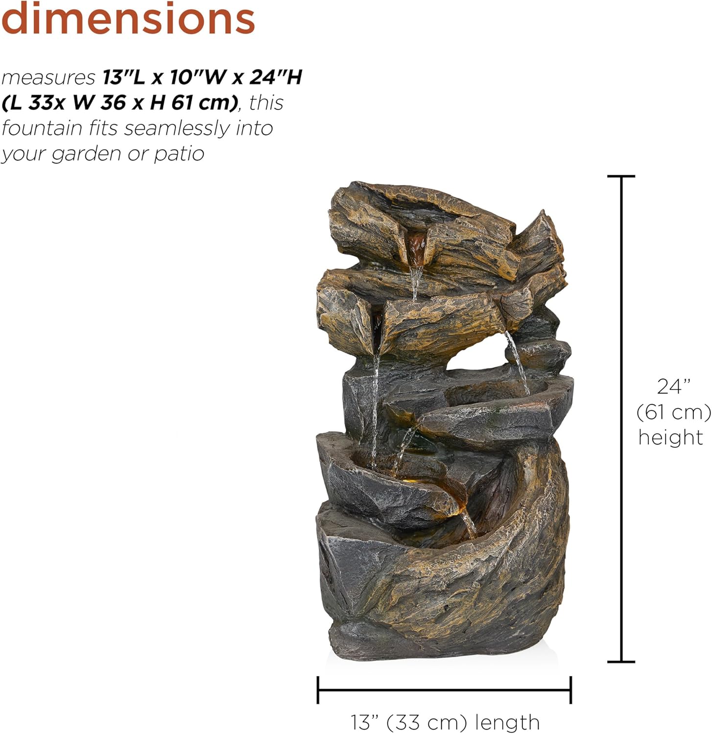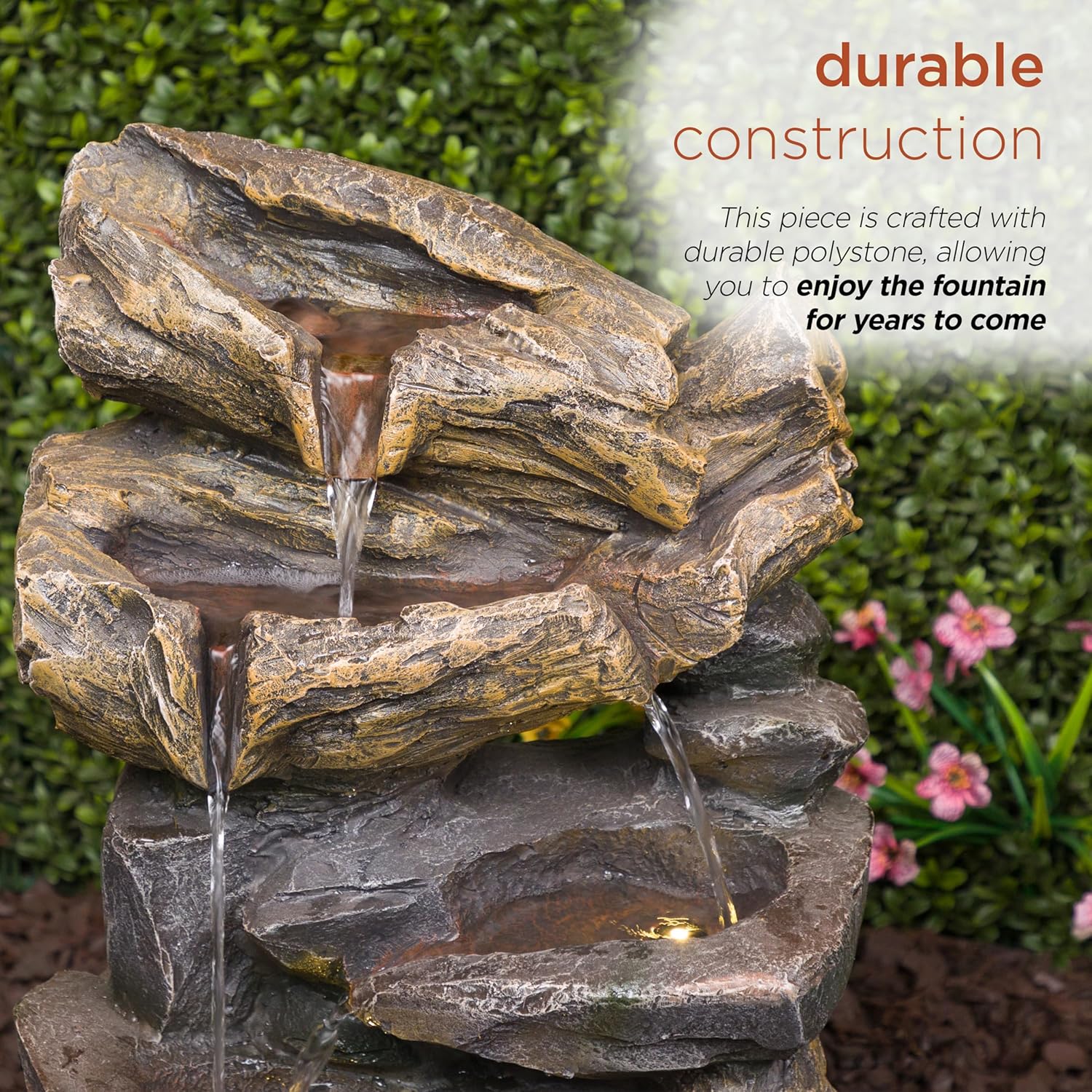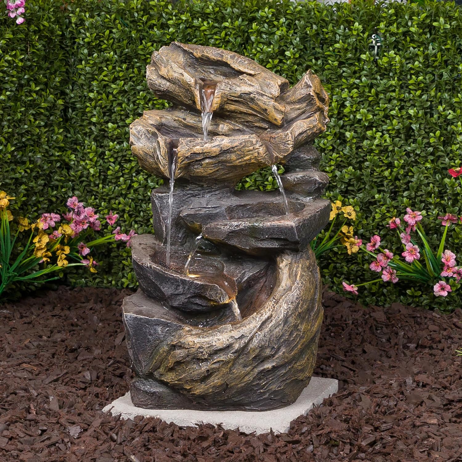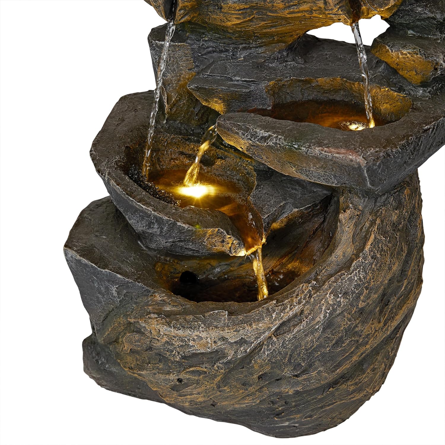Bring tranquility to your home or garden with the Alpine Corporation Cascading Rock Fountain with Warm White LED Lights. Glowing lights come together with a serene water feature to bring a charming outdoor decoration that will help you unwind. The design adds both beauty and a peaceful sound. It’s crafted from durable polystone to help it maintain its appearance, even in the elements. Use Alpine fountain cleaner # PPL102 to fight mineral deposits and remove unwanted organic build up. The warm white LED lights illuminate the cascading water, creating a soothing and visually appealing display. Place this fountain in your garden or on your patio to create a peaceful atmosphere and bring the soothing sound of flowing water to your outdoor retreat. With Alpine's 2-year Support, you can Shop With Assurance and Buy With Confidence.