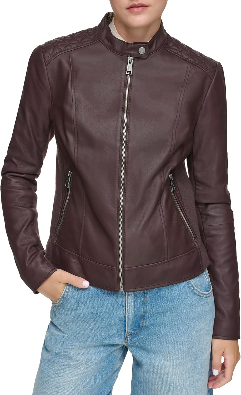 This Andrew Marc Women's Outerwear coat is a lightweight leather racer style jacket with rib knit paneling