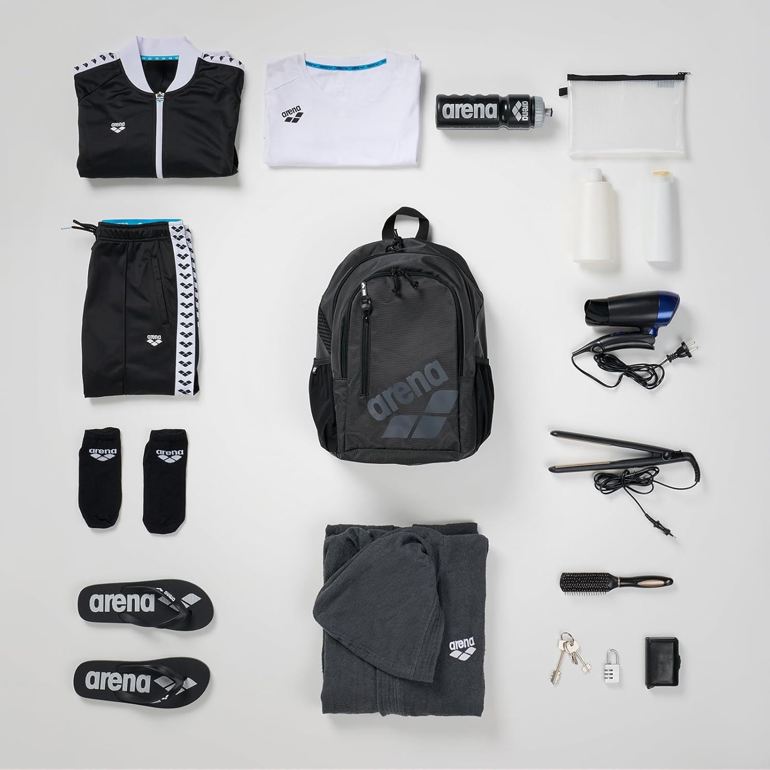 Stylish and smart! Enjoy the clever space management of the arena All Set Backpack 30L, designed to organize your swim or sports gear with ease. The two main compartments and one external zipped front pocket allow you to store wet and dry items separately. Finished with a water-repellent bottom and main fabric, it protects your gear from moisture and dirt. The two additional side mesh pockets are perfect for storing water bottles. Dimensions: 17,7in × 12,2in × 7,9in, 30 liters.