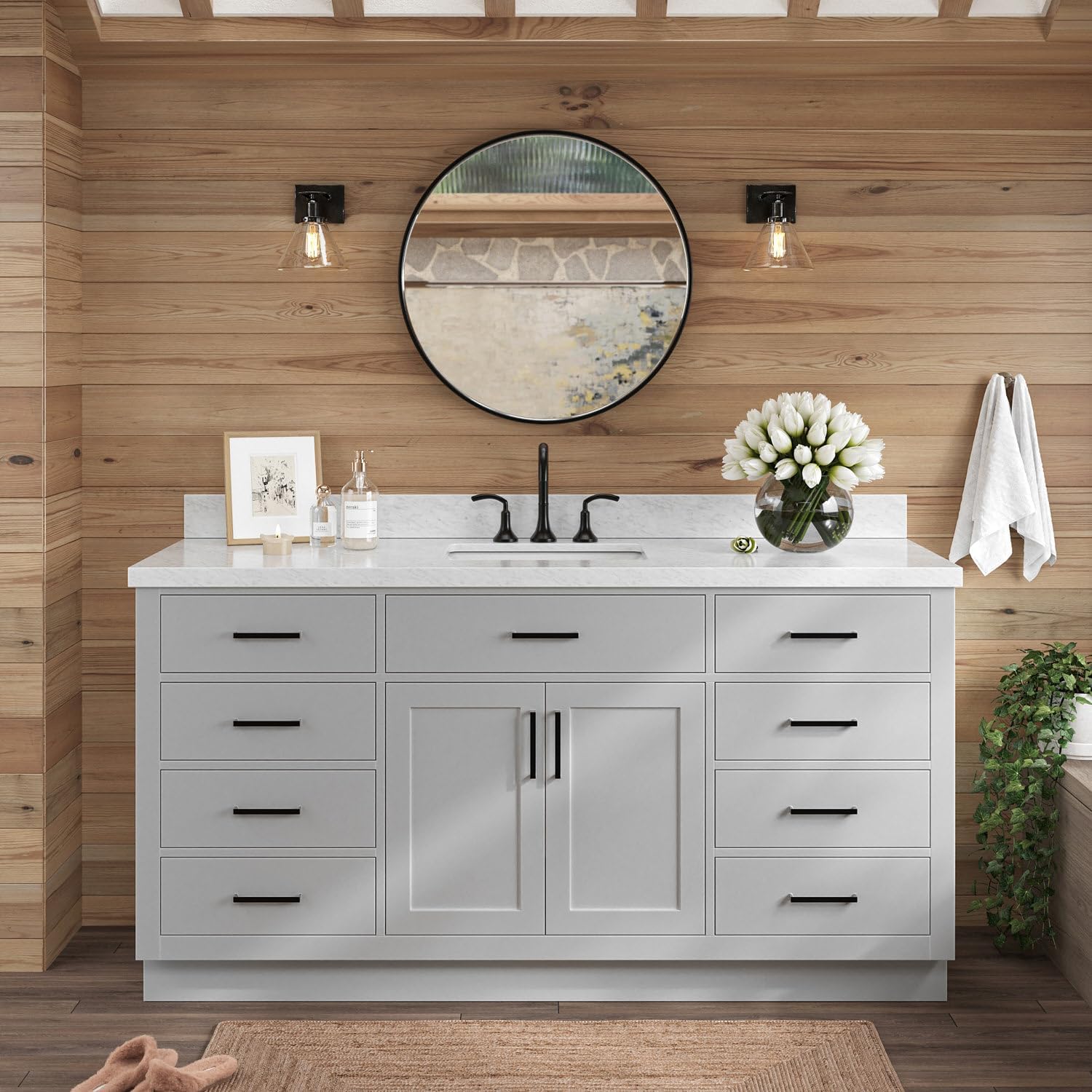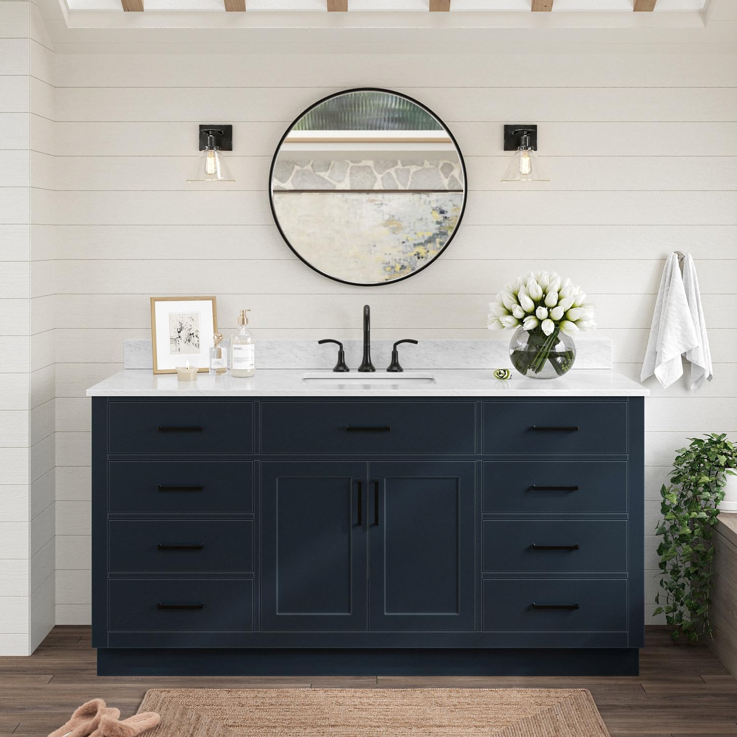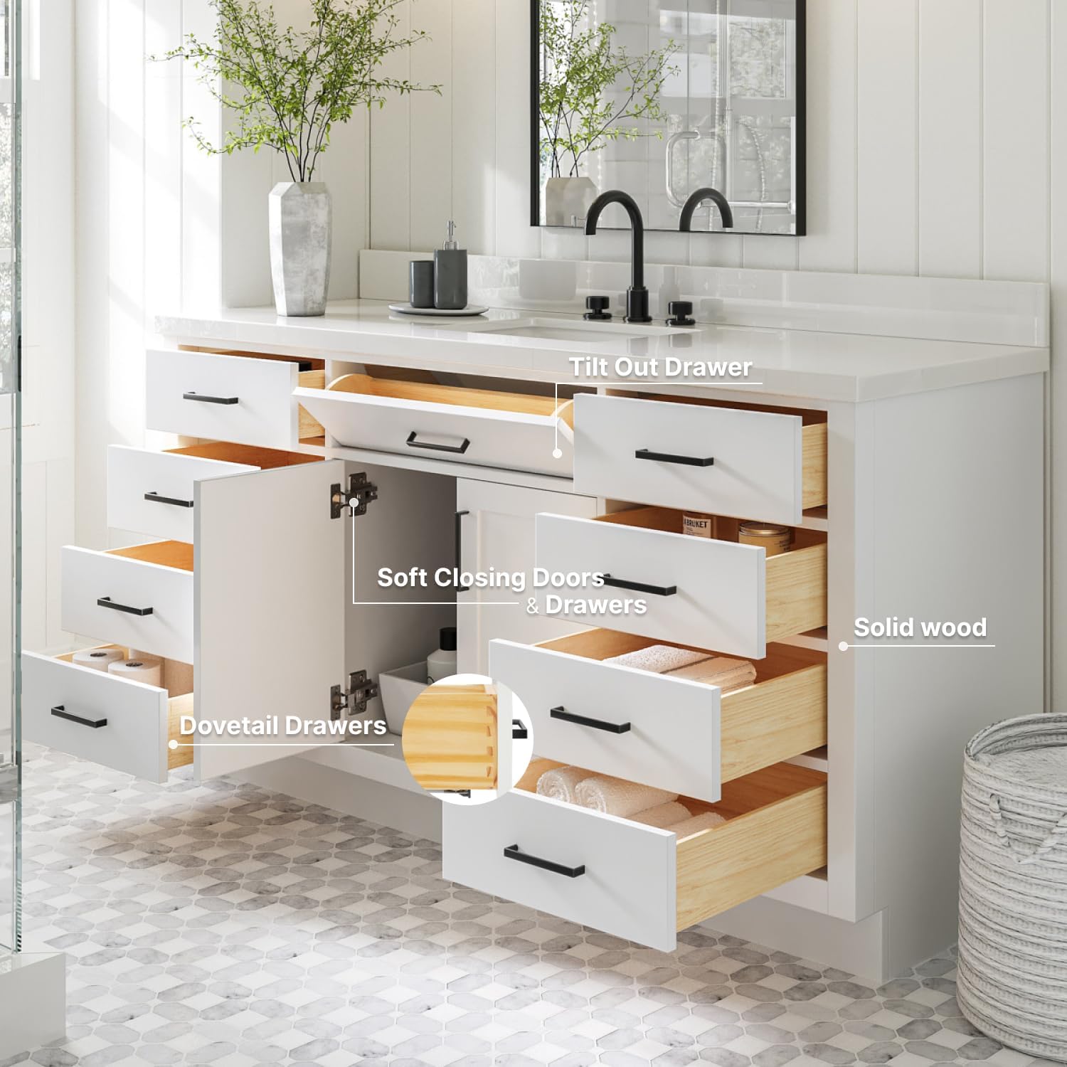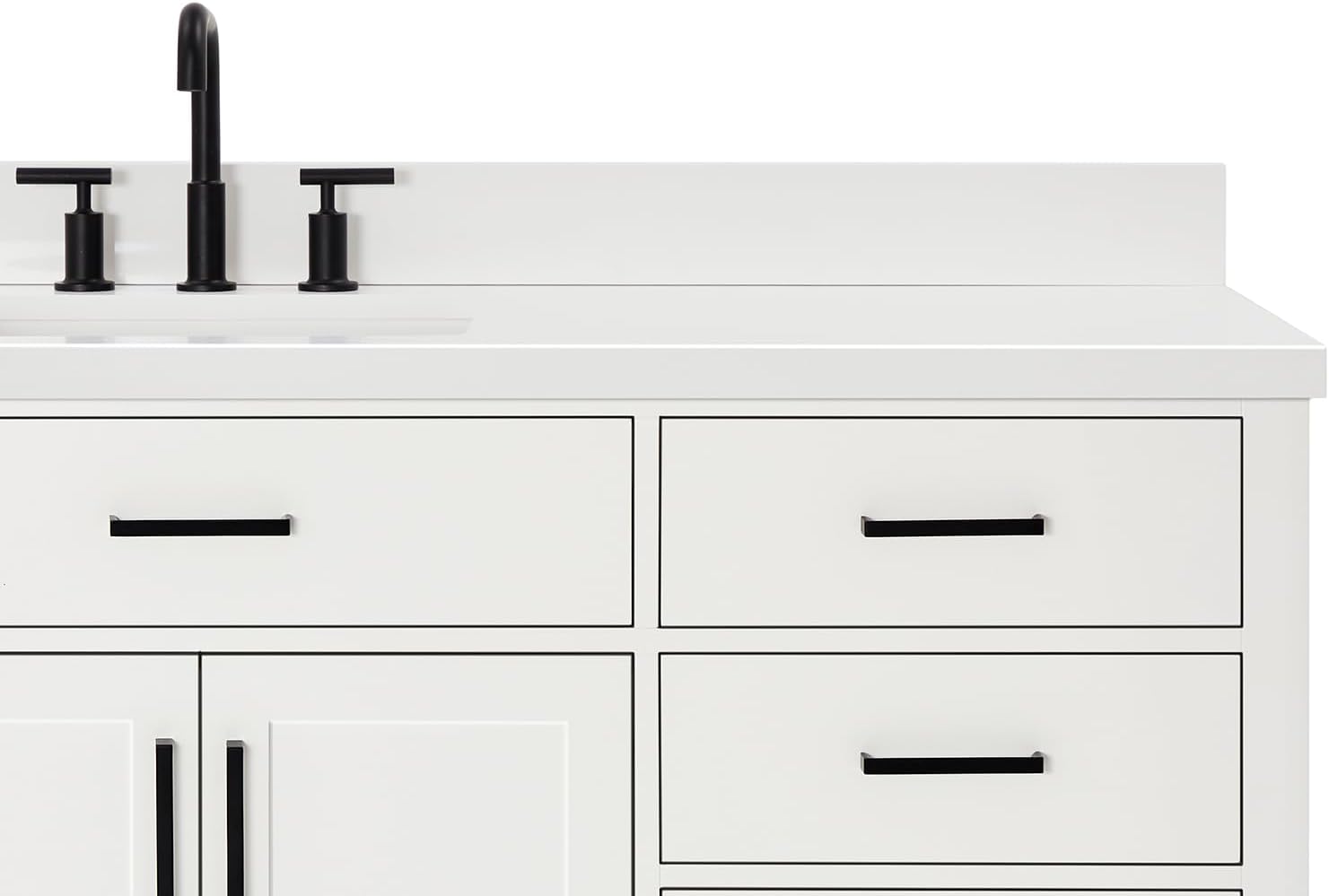 | Additional Features | 1.5" inch thick edge countertop, solid hardwood construction, soft closing doors & drawers, dovetail construction, adjustable hinges, predrilled countertop for 3-hole faucet-8" inch widespread, |