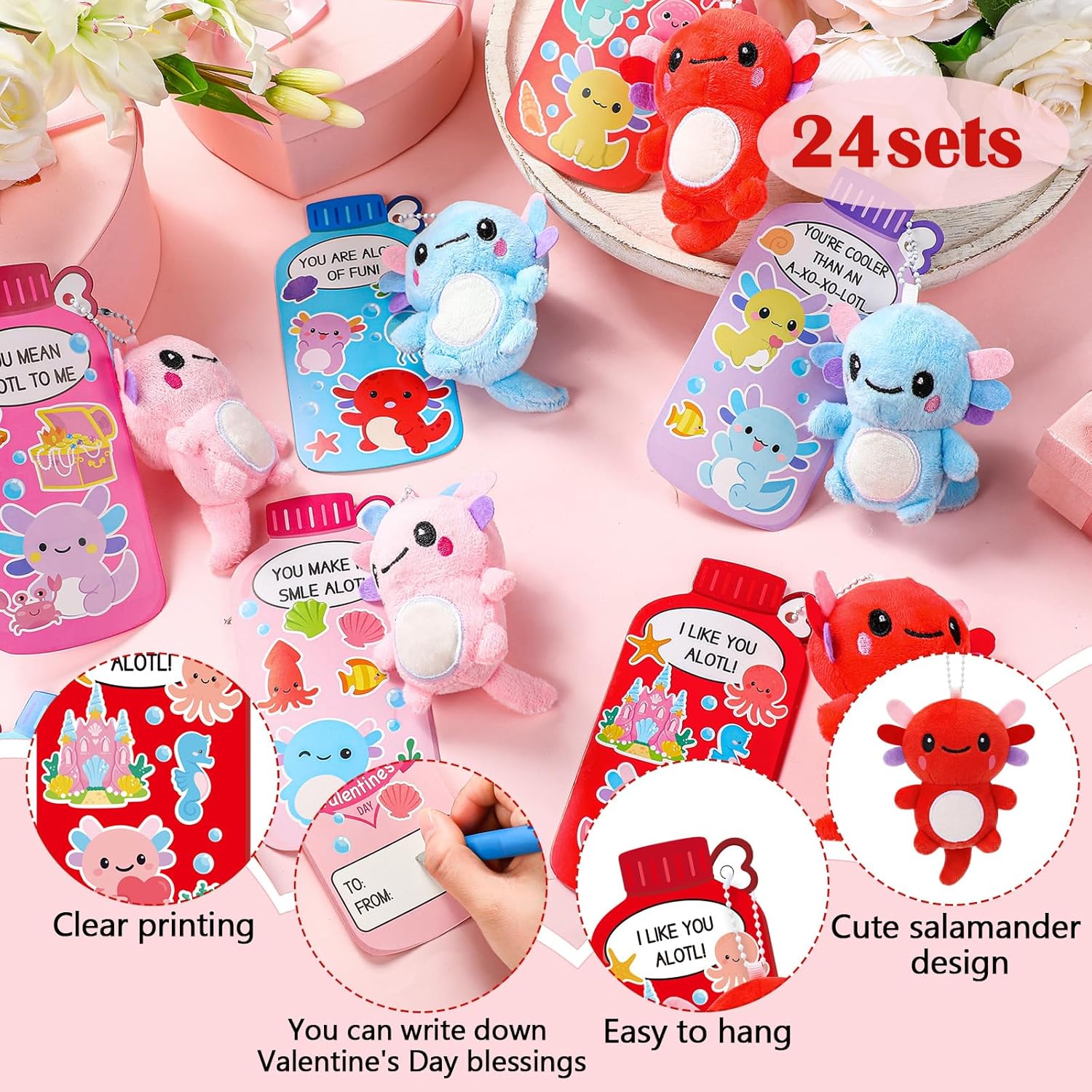 Features: Create unforgettable Valentine's Day memories with this complete gift set featuring 24 animal keychains and 24 matching greeting cards. Perfect for exchanges, party favors, or special surprises for friend. Specifications: Material: fabric, cardstock Color: classic Color Package includes: 24 x Axolotl keychains 24 x Valentine cards Notes: Manual measurement, please allow slight errors on size. The color may exist a slight difference due to different screen displays.