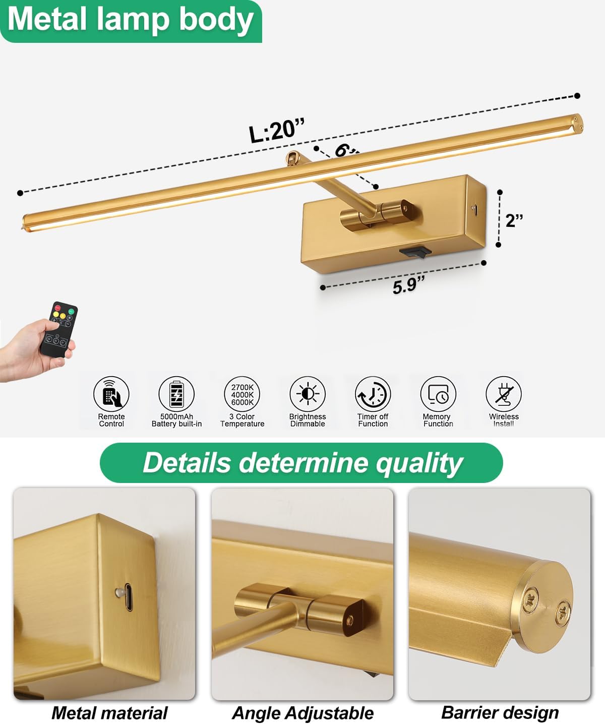 Battery Operated Picture Light with Remote,Wireless Dimmable Art Lights for Paintings Rechargeable Gallery Light Artwork Lighting for Canvas, Portrait