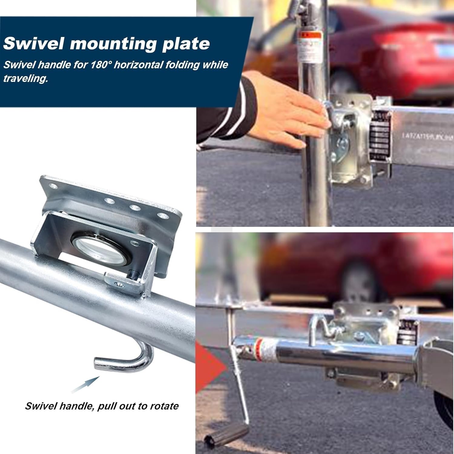 【:Removable and rotatable trailer guide wheel, high-quality galvanized surface, 34 cm wheel, includes all necessary mounting hardware, can be installed 3 inches * 5 inches trailer frame, trailer jack is designed for marine and public trailers 【Basic parameters:Product name: trailer jack/automatic trailer support wheel/guide wheel traction/telescopic support wheelProduct weight: 13 kgMaterial: steelCapacity: 900 kgLifting height: 28 cmTotal lifting distance: 80 cm-108 cm, lifting distance from the center of the mounting plate to the ground: 54 cm-82 cm 【Please note the following:-Due to manual measurement, there may be slight errors in size.-Due to different screen displays, there may be slight differences in color.-Please be careful when using the product, please refer to the actual product. 【Package: 1 * Rotating Trailer Jack