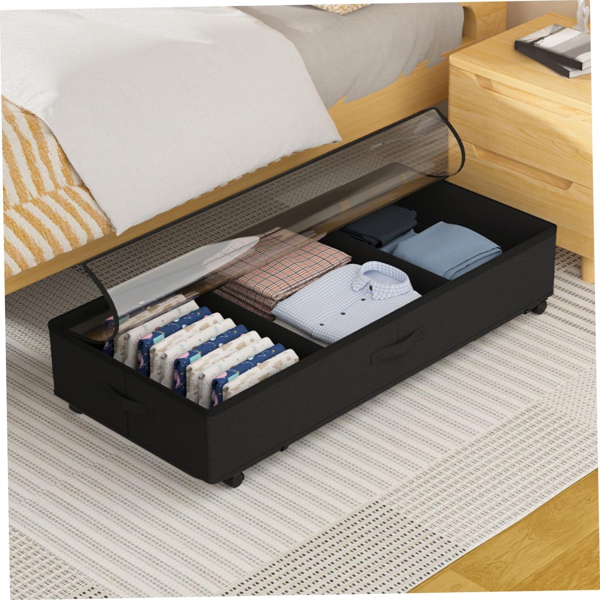 Package Include 1 x Under Bed Storage Bag Characteristics -Easy mobility: move and retrieve items effortlessly with the sliding wheels under bed storage with window. -Material:ABS, oxford cloth, iron -Product Info:Under-bed storage truck -Size:80.00X42.00X16.00cm/31.44X16.51X6.29in -Color:Black - The handles on the storage bag make it easy for you to move the under bed storage bag under-bed storage boxes. - With a large capacity, the under bed storage bag can be used to store clothes, blankets, bedding, , etc under bed organiser. - The clothes storage bin with wheel is perfect for closet, shelf, under bed, to make full use of these places for storage underbed storage rack. - The zippers on the storage case can open and close easily with fewer efforts, and the transparent window design allows you to see the items in it easily underbed storage with wheels for comforter.Goods Descriptionunder bed clothes organizers This under bed storage bag is made of ABS, oxford cloth, iron material for and use.under bed storage case Reasonable design and good craftsmanship make it provide you with a .underbed storage with wheels for comforter A great storage bag for travel, moving house or home storage using