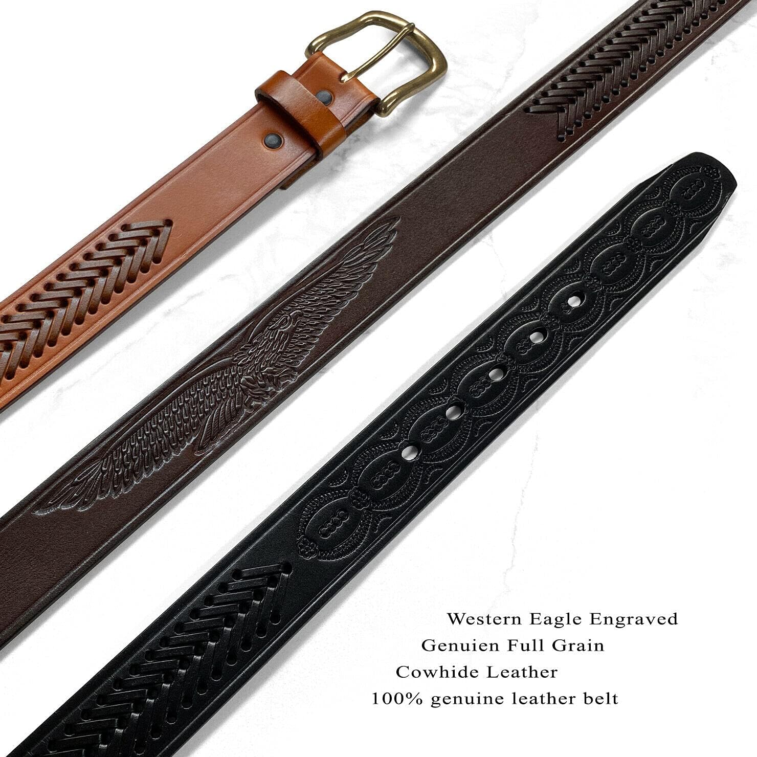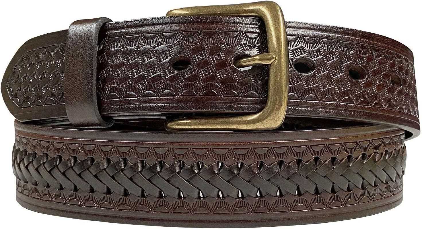 Made from high-quality one-piece full-grain cowhide leather 100% genuine leather belt.1-1/2"(38mm) wide hand-woven braided engraved belt with 5 belt holes for plenty of room for adjustments to offer maximum comfort.Classic antique buckle with full-grain leather casual belt never out of fashion.Convenient snap system for interchanging buckles making it a versatile strap for different occasions.Our belts are measured from the fold where the buckle is attached to the middle hole. If you wanted to get the best size we recommend measuring a belt that works for you from the fold to the hole where you wear the belt.
