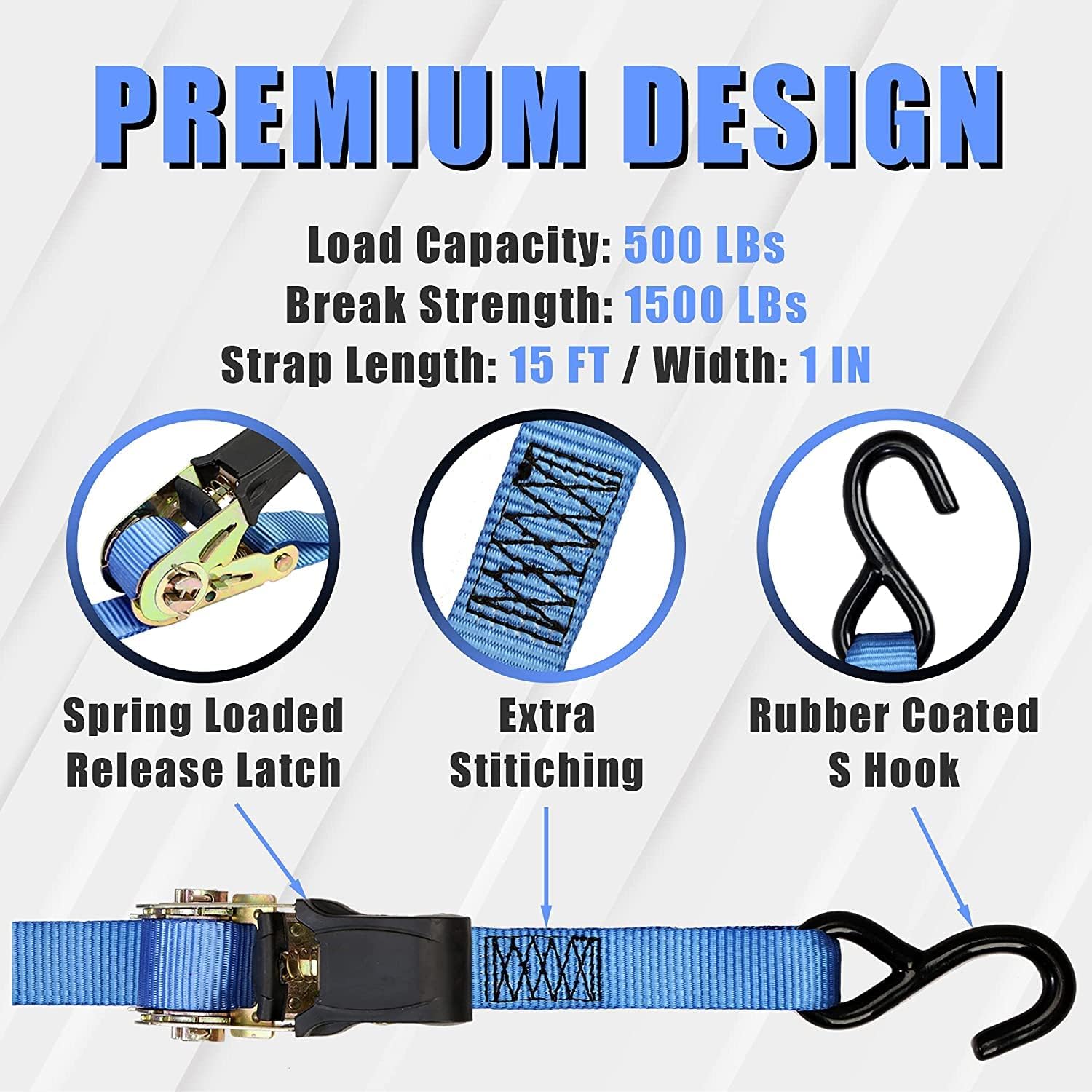 The 15 foot ratchet tie down straps have a 500 lb load limit and 1,500 lb break strength. Straps measure 1" wide and are made of industrial grade polyester webbing that are waterproof and UV ray resistant. Features a molded handle that provides superior grip and comfort and allows easy use even when wearing gloves. Ratchet tie down straps are ideal for securing various hauling loads such as household appliances and furniture, lawn equipment, ATV's, motorcycles, snowmobiles, and more. Set includes (4) ratchet straps with "S" hooks and (2) bungee cords. Includes a limited 1 year manufacturer warranty.