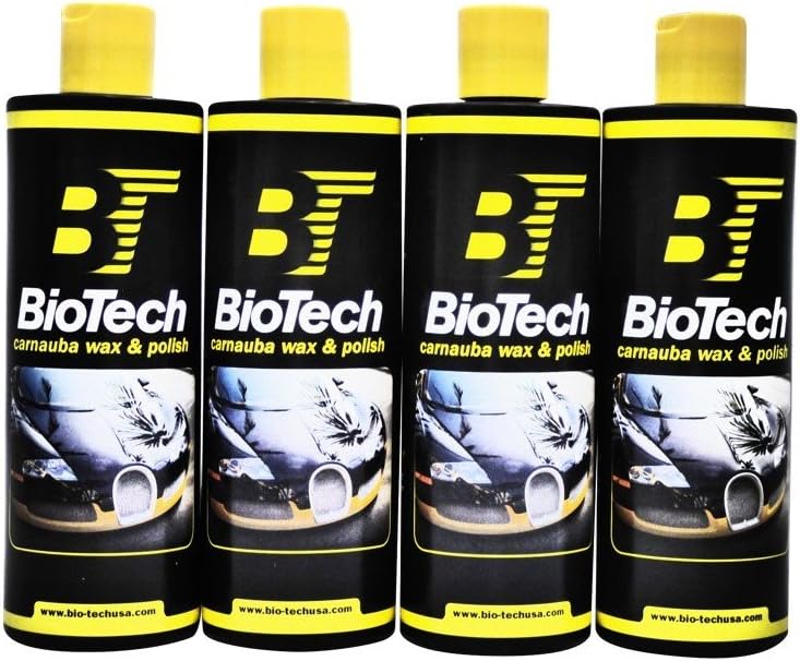 BioTech Carnauba Wax & Polish is a unique liquid carnauba polish fortified for added luster and durability, reduces fading and oxidation while maintaining that high luster finish. Great for clear coats. Keeps water beading for months. The "wipe on/ wipe off" formula is a quick and easy way to achieve maximum shine and protection with little effort. Can be used in the sun. Safe to use on: Auto body, Fiberglass boats, Motorcycles, and Airplanes. Shake Well Apply to a clean, cool surface in the shade. Apply small amount of product in a foam applicator or by hand and spread a thin, even coat over the entire vehicle and let dry. Keep off vinyl and rubber surfaces. Remove excess with clean microfiber towel
