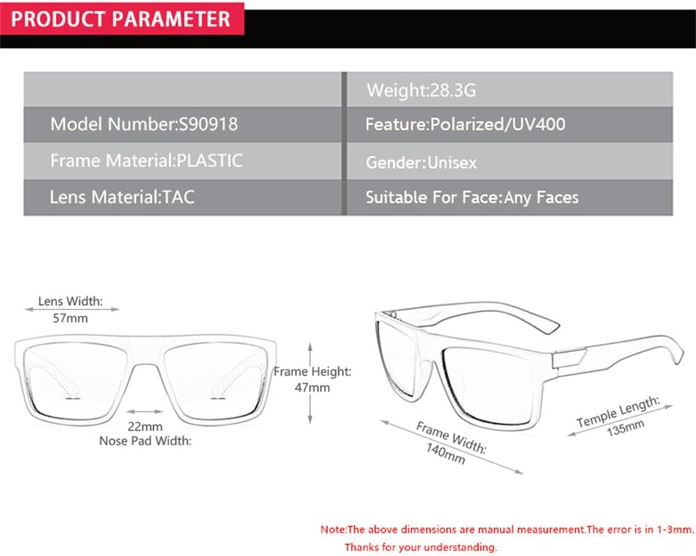 Element type:Outdoor sportsApplicable Scenarios:sportProduct Type:Sunscreen sunglassesLens Width:57mmLens Height:47mmLenses Material:TACDepartment Name:ADULTGender:MENFrame Material:PlasticLenses Optical Attribute:polarized,MIRROR,UV400Eyewear Type:SunglassesUse scope:Driving,Fishing,Sports,Hiking,TravellingQuality Materials: Crafted from premium materials, sunglasses for are designed to offer superior durability and resistance to high temperatures. sunglasses to comfortably conform to various face shapes, ensuring they stay securely in place throughout any activity.LENS: sunglasses feature specially treated lenses that provide ANTI-GLARE and polarization protection. polarized sunglasses reduce glare reflected off of roads, bodies of water, snow, and other horizontal surfaces for a more comfortable and safe experience when you're outdoors.Engineered : Engineered for stability and comfort, these sunglasses fashion are perfect for a wide range of activities and sports.Whether it's driving, cycling, motorcycling, traveling, running, hiking, golfing, or engaging in other outdoor adventures, sunglasses offer reliable performance and protection.Versatile: Designed to meet the demands of multiple sports scenarios, these sunglasses are your ideal companions for driving and cycling, baseball, motorcycle, running, fishing, climbing, hiking or other outdoor activities enthusiasts. Their versatile functionality enhances your performance while keeping you stylish.After-Sales Support: Your satisfaction is our priority. We offer exceptional after-sales service to ensure that your experience with our sunglasses is nothing short of excellent. If you have any questions or concerns, our friendly team is here to assist you.