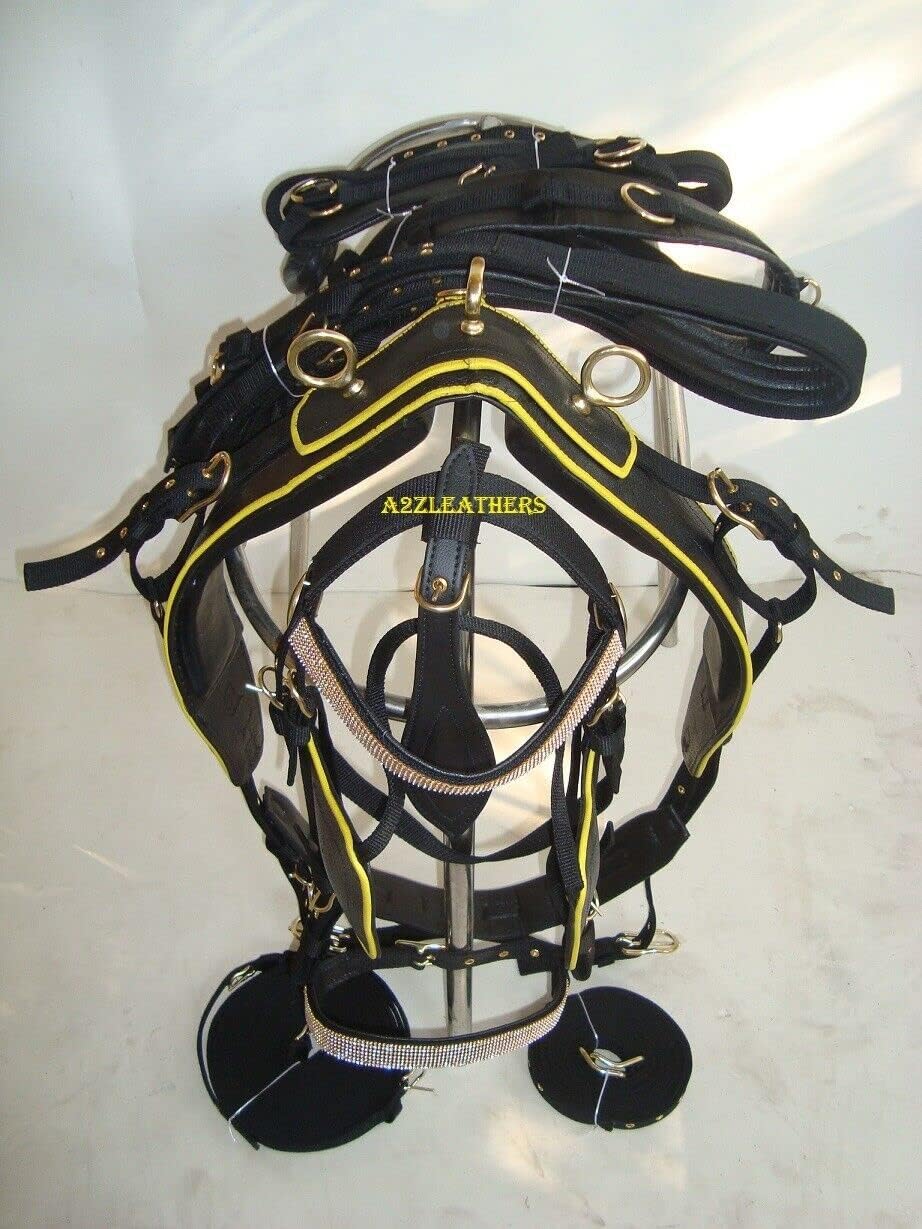 This Nylon Driving Harness Has The Best English Pattern Saddle On The Horse Back. It Has Fully Padded Bottom To Ensure Maximum Comfort For Exact Fitting. It Has Fully Padded Back Plate (Breaching) To Ensure Maximum Comfort.Made With Extra Padding For More Comfort, All Your Driving Needs In One Complete Set. It Has Double Layer And Stitched Nose Band.It Has Padded Under Girth And Very Strong Double Layered Upper Band Strapping For Overall Circumference. It Has Fully Padded Breastplate To Ensure Maximum Comfort.Including Designer Bridle With Having Diamonte Chain On Browband And Noseband And A Curve Shape Blinders. It Is Fitted With Brass Plated Yellow Fittings And Buckles Making This A Very Strong And Durable Item.