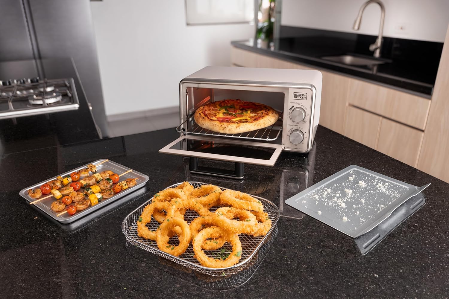 Give your kitchen a fresh new look with the BLACK+DECKER™ Crisp ‘n Bake™ PRO 4-Slice Air Fry Toaster Oven. Our stylish air fry toaster oven combines Max Space Technology and 5 pre-set cooking functions in a space-saving, contemporary design featuring metallic satin accents. With 20% more air frying capacity *, the toaster oven accommodates most 9” round baking pans or a 10” pizza, so you can create delicious family-size meals without taking up extra countertop space*. From crispy-coated chicken tenders and sweet potato fries to succulent baked salmon and golden-brown bagels, the 5 cooking functions make every meal 5 stars. The easy view glass door allows you to check on your food without losing heat. The accessories are dishwasher-safe for quick and easy cleaning and include a nonstick, PFAS-free ceramic-coated baking pan that’s 8 x more durable‡, plus a removable crumb tray, air fry basket, and wire rack.