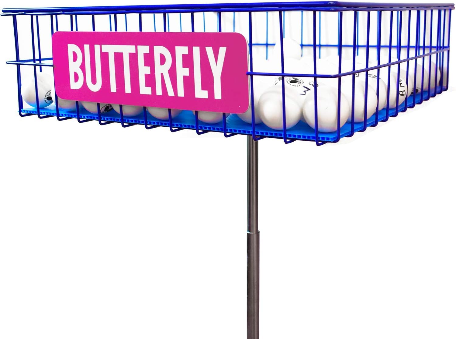 The Butterfly Ball Trainer keeps your table tennis balls within reach. Use the Butterfly Ball Trainer to hold the table tennis balls nearby while you practice. The Ball Trainer is adjustable; it's quick and easy to adjust the height of the Ball Trainer to suit your needs. The Ball Trainer also features four wheels so you can easily move the Ball Trainer wherever it is you may need it. The four wheels are able to be locked so the Ball Trainer stays in place as needed. The Butterfly Ball Trainer features a basket that is 40cm wide x 12cm tall x 40cm deep. Transport your table tennis balls easily across the court while you train and store them in the Ball Trainer when not in use. With the Ball Trainer, you'll always have a table tennis ball nearby when you need it. The Butterfly Ball Trainer is primarily blue and white, with the Butterfly logo on one side. It also has a cage style basket for visibility, it makes it easy to see when you need to refill with more table tennis balls. The Butterfly Ball Trainer is perfect for keeping balls nearby in a neat holder.